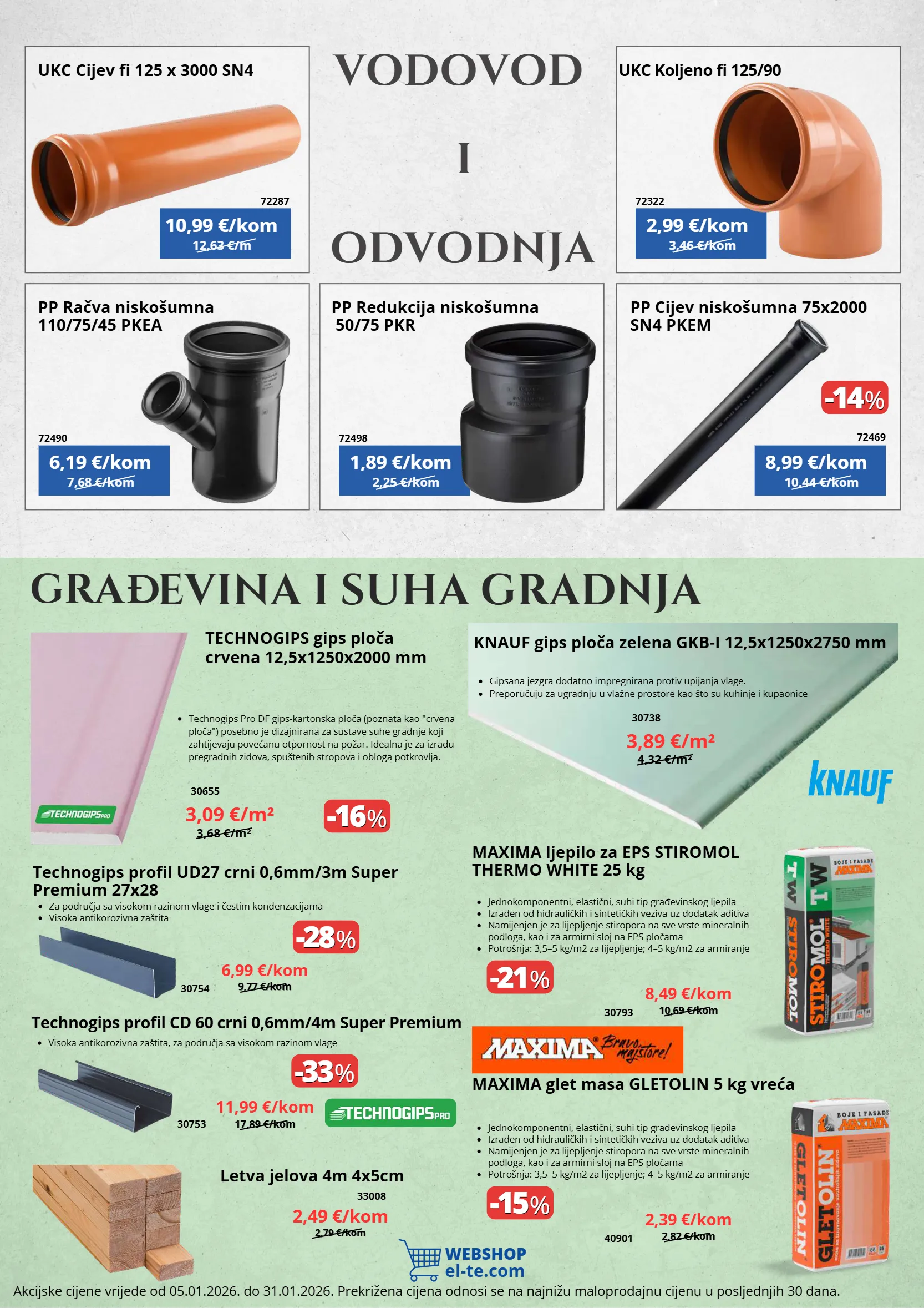 12,63 €/m 7,68 €/kom 3,46 €/kom 2,25 €/kom 10,44 €/kom -14 -14 % % -16 -16 % % -28 -28 % % -21 -21 % % -15 -15 % % -33 -33 % % webshop el-te.com 3,68 €/m² 4,32 €/m² 9,77 €/kom 9,77 €/kom 10,69 €/kom 10,69 €/kom 2,82 €/kom 2,82 €/kom 17,89 €/kom 17,89 €/kom technogips pro df gips-kartonska ploča (poznata kao "crvena ploča") posebno je dizajnirana za sustave suhe gradnje koji zahtijevaju povećanu otpornost na požar. idealna je za izradu pregradnih zidova, spuštenih stropova i obloga potkrovlja. 3,09 €/m² 30655 2,79 €/kom 2,79 €/kom gipsana jezgra dodatno impregnirana protiv upijanja vlage. preporučuju za ugradnju u vlažne prostore kao što su kuhinje i kupaonice 3,89 €/m² 30738 ukc cijev fi 125 x 3000 sn4 pp račva niskošumna 110/75/45 pkea ukc koljeno fi 125/90 pp redukcija niskošumna 50/75 pkr pp cijev niskošumna 75x2000 sn4 pkem 10,99 €/kom 6,19 €/kom 2,99 €/kom 1,89 €/kom 8,99 €/kom 72287 72322 72490 72498 72469 i vodovod odvodnja akcijske cijene vrijede od 05.01.2026. do 31.01.2026. prekrižena cijena odnosi se na najnižu maloprodajnu cijenu u posljednjih 30 dana. gra đ evina i suha gradnja technogips gips ploča crvena 12,5x1250x2000 mm knauf gips ploča zelena gkb-i 12,5x1250x2750 mm technogips profil ud27 crni 0,6mm/3m super premium 27x28 maxima ljepilo za eps stiromol thermo white 25 kg maxima glet masa gletolin 5 kg vreća 30754 30793 40901 za područja sa visokom razinom vlage i čestim kondenzacijama visoka antikorozivna zaštita jednokomponentni, elastični, suhi tip građevinskog ljepila izrađen od hidrauličkih i sintetičkih veziva uz dodatak aditiva namijenjen je za lijepljenje stiropora na sve vrste mineralnih podloga, kao i za armirni sloj na eps pločama potrošnja: 3,5–5 kg/m2 za lijepljenje; 4–5 kg/m2 za armiranje jednokomponentni, elastični, suhi tip građevinskog ljepila izrađen od hidrauličkih i sintetičkih veziva uz dodatak aditiva namijenjen je za lijepljenje stiropora na sve vrste mineralnih podloga, kao i za armirni sloj na eps pločama potrošnja: 3,5–5 kg/m2 za lijepljenje; 4–5 kg/m2 za armiranje 6,99 €/kom 8,49 €/kom 2,39 €/kom technogips profil cd 60 crni 0,6mm/4m super premium 30753 visoka antikorozivna zaštita, za područja sa visokom razinom vlage 11,99 €/kom 2,49 €/kom letva jelova 4m 4x5cm 33008
