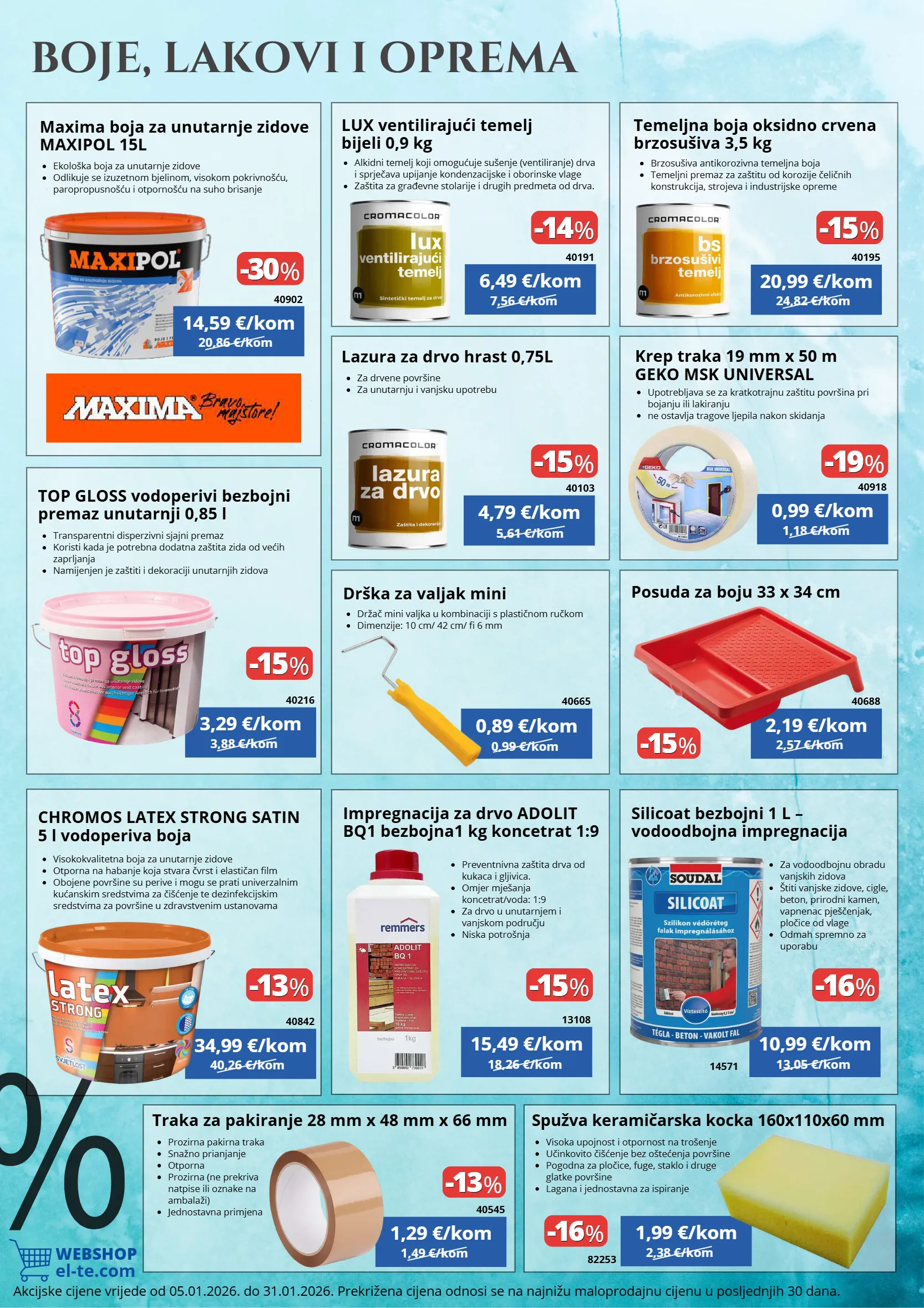 7,56 €/kom 24,82 €/kom 0,99 €/kom 18,26 €/kom 13,05 €/kom 2,57 €/kom -15 -15 % % 1,18 €/kom 5,61 €/kom 3,88 €/kom 40,26 €/kom 20,86 €/kom 1,49 €/kom 2,38 €/kom -13 -13 % % -16 -16 % % -30 -30 % % -15 -15 % % -13 -13 % % -15 -15 % % -15 -15 % % -19 -19 % % -14 -14 % % -15 -15 % % -16 -16 % % WEBSHOP el-te.com Traka za pakiranje 28 mm x 48 mm x 66 mm Spužva keramičarska kocka 160x110x60 mm Drška za valjak mini Impregnacija za drvo ADOLIT BQ1 bezbojna1 kg koncetrat 1:9 Silicoat bezbojni 1 L – vodoodbojna impregnacija TOP GLOSS vodoperivi bezbojni premaz unutarnji 0,85 l CHROMOS LATEX STRONG SATIN 5 l vodoperiva boja 0,99 €/kom 40918 LUX ventilirajući temelj bijeli 0,9 kg Alkidni temelj koji omogućuje sušenje (ventiliranje) drva i sprječava upijanje kondenzacijske i oborinske vlage Zaštita za građevne stolarije i drugih predmeta od drva. 6,49 €/kom 40191 Temeljna boja oksidno crvena brzosušiva 3,5 kg Brzosušiva antikorozivna temeljna boja Temeljni premaz za zaštitu od korozije čeličnih konstrukcija, strojeva i industrijske opreme 20,99 €/kom 40195 0,89 €/kom 15,49 €/kom 10,99 €/kom 40665 13108 14571 Posuda za boju 33 x 34 cm 2,19 €/kom 40688 Krep traka 19 mm x 50 m GEKO MSK UNIVERSAL Upotrebljava se za kratkotrajnu zaštitu površina pri bojanju ili lakiranju ne ostavlja tragove ljepila nakon skidanja Lazura za drvo hrast 0,75L 4,79 €/kom 40103 Transparentni disperzivni sjajni premaz Koristi kada je potrebna dodatna zaštita zida od većih zaprljanja Namijenjen je zaštiti i dekoraciji unutarnjih zidova Visokokvalitetna boja za unutarnje zidove Otporna na habanje koja stvara čvrst i elastičan film Obojene površine su perive i mogu se prati univerzalnim kućanskim sredstvima za čišćenje te dezinfekcijskim sredstvima za površine u zdravstvenim ustanovama 3,29 €/kom 34,99 €/kom 40216 40842 Maxima boja za unutarnje zidove MAXIPOL 15L Ekološka boja za unutarnje zidove Odlikuje se izuzetnom bjelinom, visokom pokrivnošću, paropropusnošću i otpornošću na suho brisanje 14,59 €/kom 40902 Prozirna pakirna traka Snažno prianjanje Otporna Prozirna (ne prekriva natpise ili oznake na ambalaži) Jednostavna primjena Visoka upojnost i otpornost na trošenje Učinkovito čišćenje bez oštećenja površine Pogodna za pločice, fuge, staklo i druge glatke površine Lagana i jednostavna za ispiranje 1,29 €/kom 1,99 €/kom 40545 82253 Za drvene površine Za unutarnju i vanjsku upotrebu Držač mini valjka u kombinaciji s plastičnom ručkom Dimenzije: 10 cm/ 42 cm/ fi 6 mm Preventnivna zaštita drva od kukaca i gljivica. Omjer mješanja koncetrat/voda: 1:9 Za drvo u unutarnjem i vanjskom području Niska potrošnja Za vodoodbojnu obradu vanjskih zidova Štiti vanjske zidove, cigle, beton, prirodni kamen, vapnenac pješčenjak, pločice od vlage Odmah spremno za uporabu BOJE, LAKOVI I OPREMA Akcijske cijene vrijede od 05.01.2026. do 31.01.2026. Prekrižena cijena odnosi se na najnižu maloprodajnu cijenu u posljednjih 30 dana.