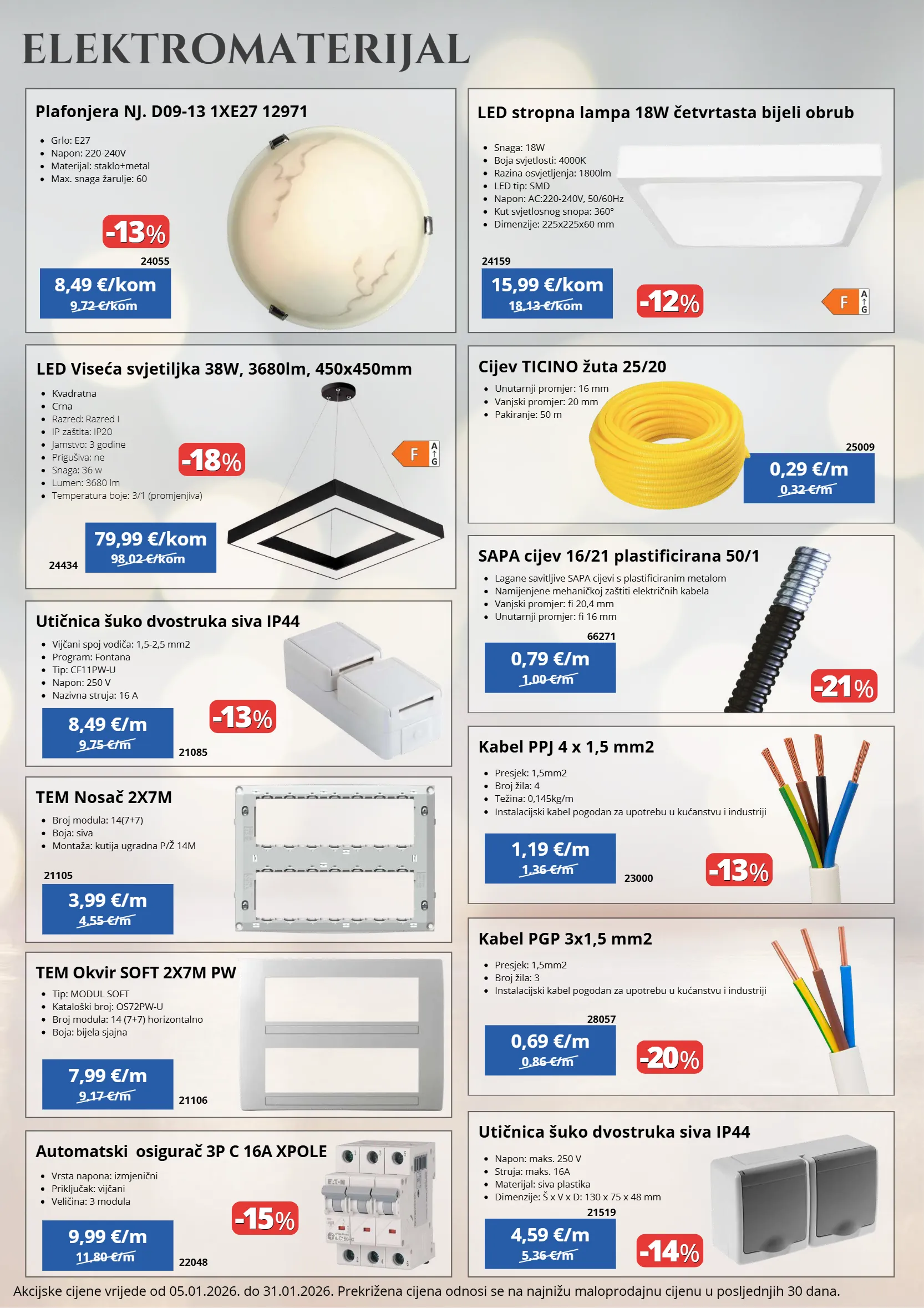 1,00 €/m 1,36 €/m 0,86 €/m 5,36 €/m 9,75 €/m 4,55 €/m 9,17 €/m 11,80 €/m 0,32 €/m 9,72 €/kom 18,13 €/kom 98,02 €/kom kvadratna crna razred: razred i ip zaštita: ip20 jamstvo: 3 godine prigušiva: ne snaga: 36 w lumen: 3680 lm temperatura boje: 3/1 (promjenjiva) -13 -13 % % -12 -12 % % -21 -21 % % -13 -13 % % -20 -20 % % -14 -14 % % -18 -18 % % -13 -13 % % -15 -15 % % sapa cijev 16/21 plastificirana 50/1 lagane savitljive sapa cijevi s plastificiranim metalom namijenjene mehaničkoj zaštiti električnih kabela vanjski promjer: fi 20,4 mm unutarnji promjer: fi 16 mm kabel ppj 4 x 1,5 mm2 kabel pgp 3x1,5 mm2 utičnica šuko dvostruka siva ip44 presjek: 1,5mm2 broj žila: 4 težina: 0,145kg/m instalacijski kabel pogodan za upotrebu u kućanstvu i industriji presjek: 1,5mm2 broj žila: 3 instalacijski kabel pogodan za upotrebu u kućanstvu i industriji napon: maks. 250 v struja: maks. 16a materijal: siva plastika dimenzije: š x v x d: 130 x 75 x 48 mm utičnica šuko dvostruka siva ip44 tem nosač 2x7m tem okvir soft 2x7m pw automatski osigurač 3p c 16a xpole vijčani spoj vodiča: 1,5-2,5 mm2 program: fontana tip: cf11pw-u napon: 250 v nazivna struja: 16 a broj modula: 14(7+7) boja: siva montaža: kutija ugradna p/ž 14m tip: modul soft kataloški broj: os72pw-u broj modula: 14 (7+7) horizontalno boja: bijela sjajna vrsta napona: izmjenični priključak: vijčani veličina: 3 modula snaga: 18w boja svjetlosti: 4000k razina osvjetljenja: 1800lm led tip: smd napon: ac:220-240v, 50/60hz kut svjetlosnog snopa: 360° dimenzije: 225x225x60 mm cijev ticino žuta 25/20 grlo: e27 napon: 220-240v materijal: staklo+metal max. snaga žarulje: 60 unutarnji promjer: 16 mm vanjski promjer: 20 mm pakiranje: 50 m 0,79 €/m 1,19 €/m 0,69 €/m 4,59 €/m 8,49 €/m 3,99 €/m 7,99 €/m 9,99 €/m 0,29 €/m 66271 23000 28057 21519 21085 21105 21106 22048 25009 8,49 €/kom plafonjera nj. d09-13 1xe27 12971 24055 led stropna lampa 18w četvrtasta bijeli obrub 15,99 €/kom 24159 led viseća svjetiljka 38w, 3680lm, 450x450mm 79,99 €/kom 24434 elektromaterijal akcijske cijene vrijede od 05.01.2026. do 31.01.2026. prekrižena cijena odnosi se na najnižu maloprodajnu cijenu u posljednjih 30 dana.