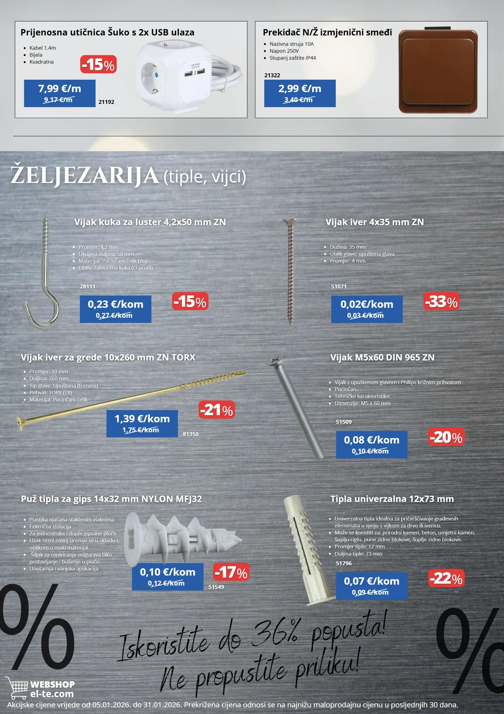 Ulica Nikole Tesle 16 48260 Križevci 048/682-789 info@el-te.com www.el-te.com EL-TE Trgovina RADNO VRIJEME: Radnim danom 07:00 - 19:30 Subotom 07:00 - 13:00 Napomena: Zadržavamo pravo na tiskarske i druge pogreške kao i promjene modela. Fotografije su simbolične i ne moraju odgovarati stvarnom izgledu proizvoda. Ponuda vrijedi od 05.01.2026. do 31.01.2026. ili do isteka zaliha. Cijene su iskazane u eurima s uključenim PDV-om. Cijene u katalogu vrijede isključivo za navedene šifre artikala i za sve vrste plaćanja.