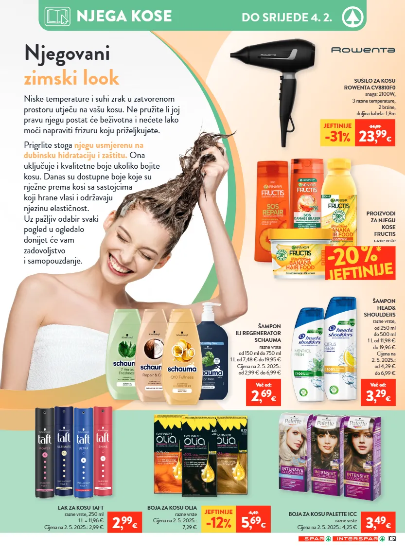 njegovani zimski look niske temperature i suhi zrak u zatvorenom prostoru utječu na vašu kosu. ne pružite li joj pravu njegu postat će beživotna i nećete lako moći napraviti frizuru koju priželjkujete. prigrlite stoga njegu usmjerenu na dubinsku hidrataciju i zaštitu. ona uključuje i kvalitetne boje ukoliko bojite kosu. danas su dostupne boje koje su nježne prema kosi sa sastojcima koji hrane vlasi i održavaju njezinu elastičnost. uz pažljiv odabir svaki pogled u ogledalo donijet će vam zadovoljstvo i samopouzdanje. boja za kosu olia razne vrste cijena na 2. 5. 2025.: 7,29 € jeftinije -12 % 6,49 5 , 69 € lak za kosu taft razne vrste, 250 ml 1 l = 11,96 € cijena na 2. 5. 2025.: 2,99 € proizvodi za njegu kose fructis razne vrste -20 % * jeftinije šampon ili regenerator schauma razne vrste od 150 ml do 750 ml 1 l od 7,48 € do 19,95 € cijena na 2. 5. 2025.: od 2,99 € do 6,99 € već od: 2 , 69 € šampon head& shoulders razne vrste, od 250 ml do 500 ml 1 l od 11,98 € do 19,96 € cijena na 2. 5. 2025.: od 4,29 € do 6,99 € već od: 3 , 29 € jeftinije -31 % 34,99 23 , 99 € boja za kosu palette icc razne vrste cijena na 2. 5. 2025.: 4,25 € 2 , 99 € 3 , 49 € sušilo za kosu rowenta cv8810f0 snaga: 2100w, 3 razine temperature, 2 brzine, duljina kabela: 1,8m do srijede 4. 2. njega kose