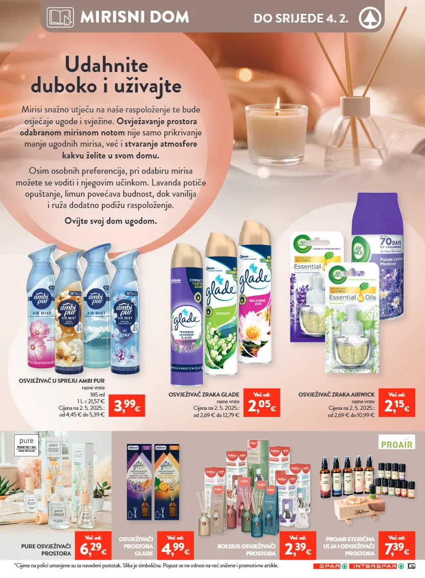 mirisi snažno utječu na naše raspoloženje te bude osjećaje ugode i svježine. osvježavanje prostora odabranom mirisnom notom nije samo prikrivanje manje ugodnih mirisa, već i stvaranje atmosfere kakvu želite u svom domu. osim osobnih preferencija, pri odabiru mirisa možete se voditi i njegovim učinkom. lavanda potiče opuštanje, limun povećava budnost, dok vanilija i ruža dodatno podižu raspoloženje. ovijte svoj dom ugodom. udahnite duboko i uživajte pure osvježivači prostora osvježivači prostora glade proair eterična ulja i osvježivači prostora bolsius osvježivači prostora osvježivač zraka airwick razne vrste cijena na 2. 5. 2025.: od 2,69 € do 10,99 € osvježivač zraka glade razne vrste cijena na 2. 5. 2025.: od 2,69 € do 12,79 € osvježivač u spreju ambi pur razne vrste 185 ml 1 l = 21,57 € cijena na 2. 5. 2025.: od 4,45 € do 5,39 € već od: 2 , 15 € već od: 7 , 39 € već od: 4 , 99 € već od: 2 , 39 € već od: 6 , 29 € već od: 2 , 05 € 3 , 99 € do srijede 4. 2. mirisni dom *cijene na polici umanjene su za navedeni postotak. slika je simbolična. popust se ne odnosi na već snižene i promotivne artikle.