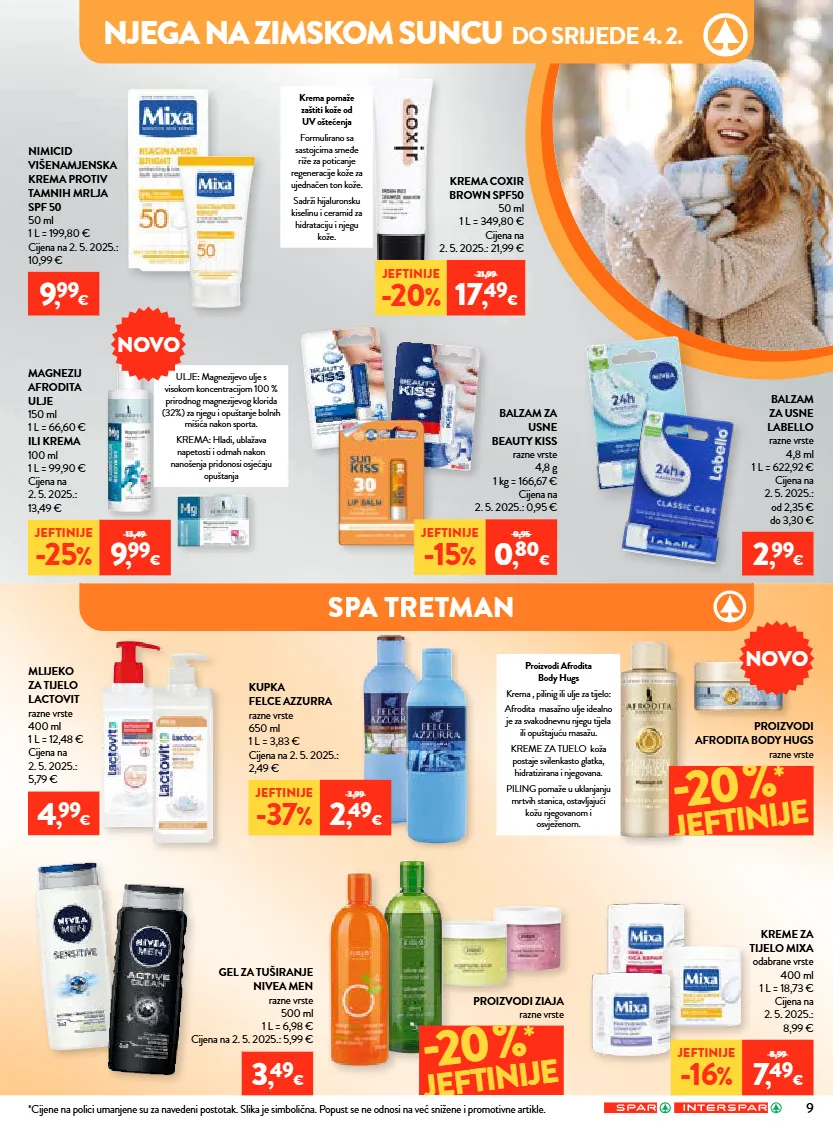 njega na zimskom suncu spa tretman do srijede 4. 2. *cijene na polici umanjene su za navedeni postotak. slika je simbolična. popust se ne odnosi na već snižene i promotivne artikle. 9 ulje: magnezijevo ulje s visokom koncentracijom 100 % prirodnog magnezijevog klorida (32%) za njegu i opuštanje bolnih mišića nakon sporta. krema: hladi, ublažava napetosti i odmah nakon nanošenja pridonosi osjećaju opuštanja gel za tuširanje nivea men razne vrste 500 ml 1 l = 6,98 € cijena na 2. 5. 2025.: 5,99 € balzam za usne labello razne vrste 4,8 ml 1 l = 622,92 € cijena na 2. 5. 2025.: od 2,35 € do 3,30 € magnezij afrodita ulje 150 ml 1 l = 66,60 € ili krema 100 ml 1 l = 99,90 € cijena na 2. 5. 2025.: 13,49 € jeftinije -25 % 13,49 9 , 99 € mlijeko za tijelo lactovit razne vrste 400 ml 1 l = 12,48 € cijena na 2. 5. 2025.: 5,79 € balzam za usne beauty kiss razne vrste 4,8 g 1 kg = 166,67 € cijena na 2. 5. 2025.: 0,95 € jeftinije -15 % 0,95 0 , 80 € kupka felce azzurra razne vrste 650 ml 1 l = 3,83 € cijena na 2. 5. 2025.: 2,49 € kreme za tijelo mixa odabrane vrste 400 ml 1 l = 18,73 € cijena na 2. 5. 2025.: 8,99 € jeftinije -37 % 3,99 2 , 49 € jeftinije -16 % 8,99 7 , 49 € krema coxir brown spf50 50 ml 1 l = 349,80 € cijena na 2. 5. 2025.: 21,99 € krema pomaže zaštiti kože od uv oštećenja formulirano sa sastojcima smeđe riže za poticanje regeneracije kože za ujednačen ton kože. sadrži hijaluronsku kiselinu i ceramid za hidrataciju i njegu kože. proizvodi afrodita body hugs krema , pilinig ili ulje za tijelo: afrodita masažno ulje idealno je za svakodnevnu njegu tijela ili opuštajuću masažu. kreme za tijelo koža postaje svilenkasto glatka, hidratizirana i njegovana. piling pomaže u uklanjanju mrtvih stanica, ostavljajući kožu njegovanom i osvježenom. jeftinije -20 % 21,99 17 , 49 € proizvodi afrodita body hugs razne vrste proizvodi ziaja razne vrste -20 % * jeftinije -20 % * jeftinije 9 , 99 € 2 , 99 € 4 , 99 € 3 , 49 € nimicid višenamjenska krema protiv tamnih mrlja spf 50 50 ml 1 l = 199,80 € cijena na 2. 5. 2025.: 10,99 € novo novo