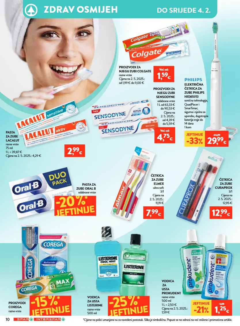 zdrav osmijeh *cijene na polici umanjene su za navedeni postotak. slika je simbolična. popust se ne odnosi na već snižene i promotivne artikle. do srijede 4. 2. 10 proizvodi za njegu zubi sensodyne odabrane vrste 1 l od 63,33 € do 90,53 € cijena na 2. 5. 2025.: od 4,39 € do 5,59 € pasta za zube oral b odabrane vrste vodica za usta listerine razne vrste 500 ml proizvodi corega razne vrste proizvodi za njegu zubi colgate razne vrste cijena na 2. 5. 2025.: od 1,99 € do 9,00 € -25 % * jeftinije -15 % * jeftinije -20 % * jeftinije jeftinije -33 % 44,99 29 , 99 € jeftinije -21 % 1,59 1 , 25 € 12 , 99 € 7 , 99 € 2 , 99 € pasta za zube lacalut razne vrste 75 ml 1 l = 39,87 € cijena na 2. 5. 2025.: 4,29 € četkica za zube elmex ultra soft 3/1 cijena na 2. 5. 2025.: 11,19 € vodica za usta prokudent razne vrste 500 ml 1 l = 2,50 € cijena na 2. 5. 2025.: 1,59 € četkica za zube curaprox 3/1 cijena na 2. 5. 2025.: 12,95 € već od: 1 , 59 € već od: 4 , 75 € električna četkica za zube philips hx3651/13 sonična tehnologija, quadpacer i smartimer, sigurna i nježna za uporabu, dugotrajna baterija traje do 14 dana 1 kom