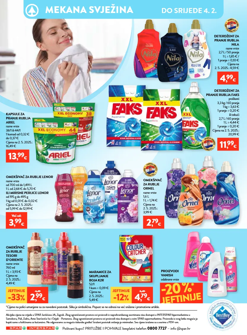 meko i udobno mekana svježina do srijede 4. 2. 11 , 99 € 4 , 99 € deterdžent za pranje rublja faks praškasti 3,3 kg / 60 pranja 1 kg = 3,63 € 1 pranje = 0,20 € ili tekući 2,7 l / 60 pranja 1 l = 4,44 € 1 pranje = 0,20 € cijena na 2. 5. 2025.: 20,99 € omekšivač za rublje lenor razne vrste od 700 ml do 1,491 l 1 l od 2,68 € do 5,70 € ili mirisne perlice lenor od 195 g do 495 g 1 kg od 0,01 € do 0,02 € cijena na 2. 5. 2025.: od 5,99 € do 12,99 € deterdžent za pranje rublja nila razne vrste 2,7 l / 50 pranja 1 l = 1,85 € / 1 pranje = 0,10 € cijena na 2. 5. 2025.: 4,59 € omekšivač za rublje ornel razne vrste 1,6 l 1 l = 1,74 € cijena na 2. 5. 2025.: 3,99 € kapsule za pranje rublja ariel razne vrste 38/1 ili 44/1 1 komad od 0,32 € do 0,37 € cijena na 2. 5. 2025.: 16,49 € već od: 3 , 99 € 2 , 79 € 13 , 99 € proizvodi vanish odabrane vrste -20 % * jeftinije jeftinije -12 % 5,49 4 , 79 € maramice za skupljanje boja k2r 52/1 1 kom = 0,09 € cijena na 2. 5. 2025.: 5,49 € omekšivač za rublje tesori d’oriente razne vrste 760 ml 1 l = 3,93 € cijena na 2. 5. 2025.: 4,49 € jeftinije -33 % 4,49 2 , 99 € akcijske cijene ne vrijede u spar jurišićeva 2a, zagreb. zbog ograničenosti prostora svi proizvodi iz neprehrambenog asortimana nisu dostupni u interspar hipermarketima u samoboru, puli, zadru, ante starčevića 5a i osijek - portanova. zbog ograničenosti prostora svi proizvodi nisu dostupni u svim spar supermarketima. proizvode iz ovog letka moguće je kupiti samo u količinama za kućanstvo. ne odgovaramo za moguće tiskarske greške! izraženi postotak sniženja je minimalan. sve cijene izražene su u eurima s pdv-om. poštvani kupci! pritužbe i pohvale besplatni telefon 0800 7727 – info @spar.hr *cijene na polici umanjene su za navedeni postotak. slika je simbolična. popust se ne odnosi na već snižene i promotivne artikle.