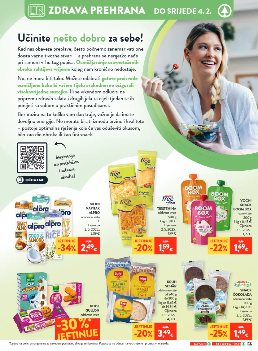 snack čokolada odabrane vrste 100 g 1 kg = 14,90 € cijena na 2. 5. 2025.: 1,99 € jeftinije -25 % 1,99 1 , 49 € voćni snack boom box razne vrste 200 g 1 kg = 8,45 € cijena na 2. 5. 2025.: 1,99 € jeftinije -22 % 2,19 1 , 69 € biljni napitak alpro odabrane vrste 1 l cijena na 2. 5. 2025.: 2,39 € jeftinije -34 % 3,79 2 , 49 € tjestenina odabrane vrste 500 g 1 kg = 3,18 € cijena na 2. 5. 2025.: 1,99 € jeftinije -20 % 1,99 1 , 59 € kruh schär odabrane vrste od 240 g do 300 g 1 kg od 11,63 € do 14,54 € cijena na 2. 5. 2025.: 4,39 € jeftinije -20 % 4,39 3 , 49 € keksi gullon odabrane vrste -30 % * jeftinije kad nas obaveze preplave, često počnemo zanemarivati one doista važne životne stvari – a prehrana se nerijetko nađe pri samom vrhu tog popisa. osmišljavanje uravnoteženih obroka zahtijeva vrijeme kojeg nam kronično nedostaje. no, ne mora biti tako. možete odabrati gotove proizvode osmišljene kako bi vašem tijelu svakodnevno osigurali visokovrijedne sastojke. ili se vikendom odlučiti na pripremu zdravih salata i drugih jela za cijeli tjedan te ih ponijeti sa sobom u praktičnim posudicama. bez obzira na to koliko vam dan traje, važno je da imate dovoljno energije. ne morate birati između brzine i kvalitete – postoje optimalna rješenja koja će vas oduševiti okusom, bilo kao dio obroka ili kao fini snack. učinite nešto dobro za sebe! inspiracija za praktične i zdrave obroke! očitaj me do srijede 4. 2. zdrava prehrana *cijene na polici umanjene su za navedeni postotak. slika je simbolična. popust se ne odnosi na već snižene i promotivne artikle.