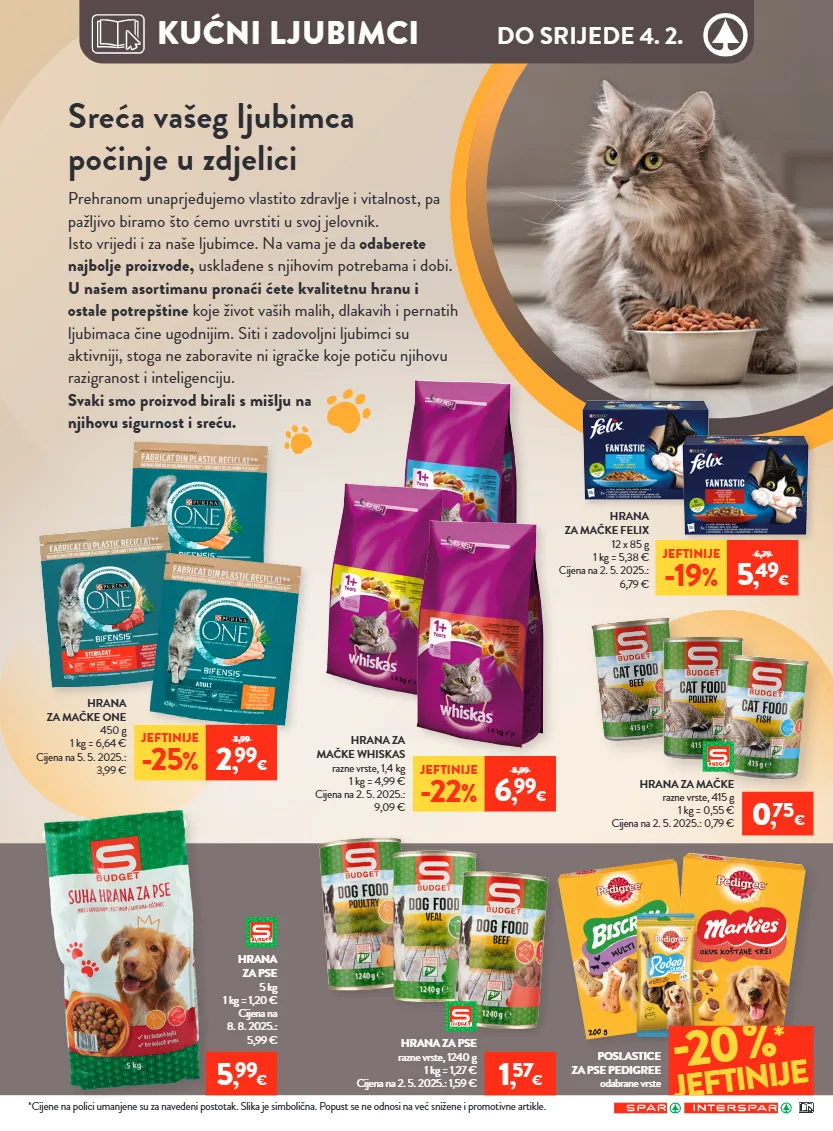 prehranom unaprjeđujemo vlastito zdravlje i vitalnost, pa pažljivo biramo što ćemo uvrstiti u svoj jelovnik. isto vrijedi i za naše ljubimce. na vama je da odaberete najbolje proizvode, usklađene s njihovim potrebama i dobi. u našem asortimanu pronaći ćete kvalitetnu hranu i ostale potrepštine koje život vaših malih, dlakavih i pernatih ljubimaca čine ugodnijim. siti i zadovoljni ljubimci su aktivniji, stoga ne zaboravite ni igračke koje potiču njihovu razigranost i inteligenciju. svaki smo proizvod birali s mišlju na njihovu sigurnost i sreću. hrana za mačke whiskas razne vrste, 1,4 kg 1 kg = 4,99 € cijena na 2. 5. 2025.: 9,09 € jeftinije -22 % 8,99 6 , 99 € hrana za mačke felix 12 x 85 g 1 kg = 5,38 € cijena na 2. 5. 2025.: 6,79 € jeftinije -19 % 6,79 5 , 49 € hrana za pse 5 kg 1 kg = 1,20 € cijena na 8. 8. 2025.: 5,99 € 5 , 99 € hrana za pse razne vrste, 1240 g 1 kg = 1,27 € cijena na 2. 5. 2025.: 1,59 € 1 , 57 € poslastice za pse pedigree odabrane vrste -20 % * jeftinije hrana za mačke razne vrste, 415 g 1 kg = 0,55 € cijena na 2. 5. 2025.: 0,79 € 0 , 75 € jeftinije -25 % 3,99 2 , 99 € hrana za mačke one 450 g 1 kg = 6,64 € cijena na 5. 5. 2025.: 3,99 € sreća vašeg ljubimca počinje u zdjelici do srijede 4. 2. kućni ljubimci *cijene na polici umanjene su za navedeni postotak. slika je simbolična. popust se ne odnosi na već snižene i promotivne artikle.