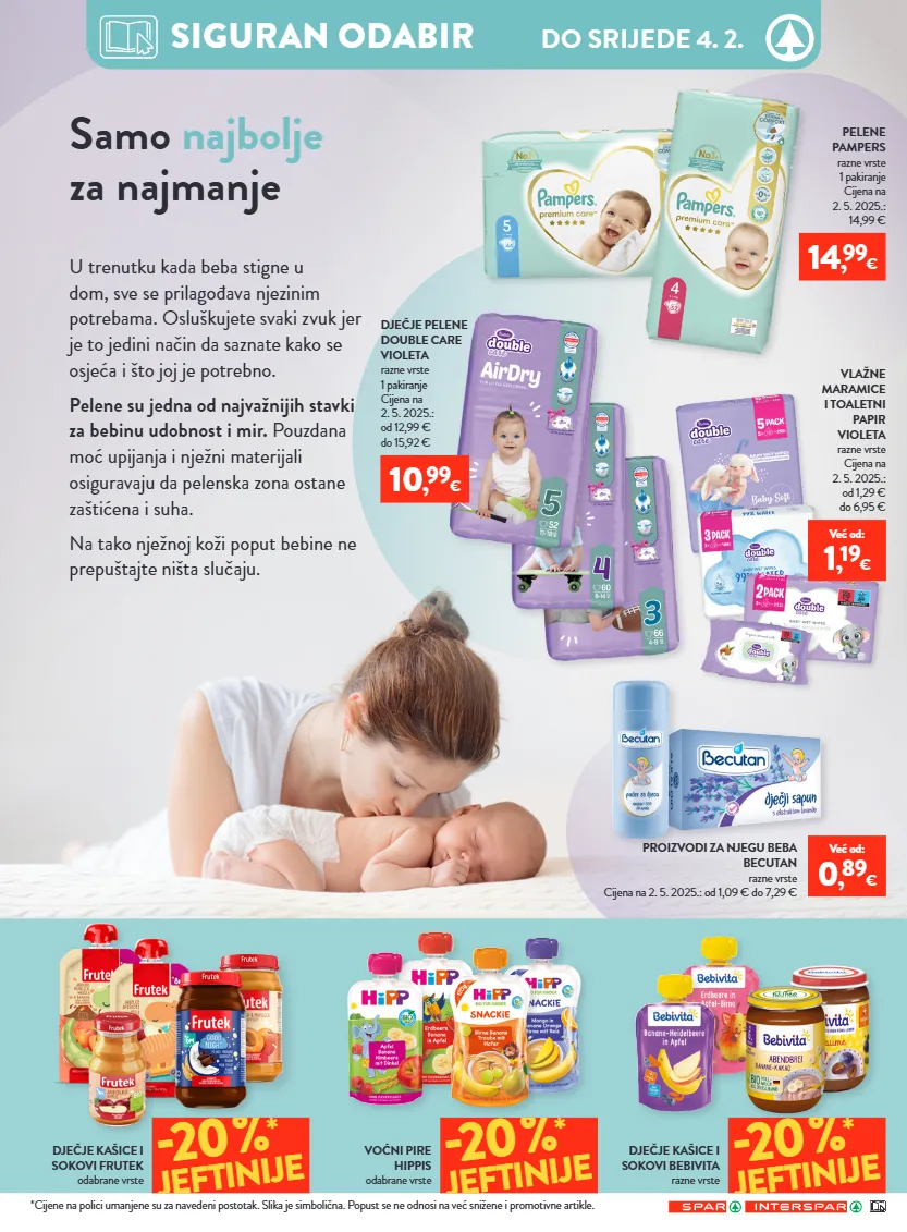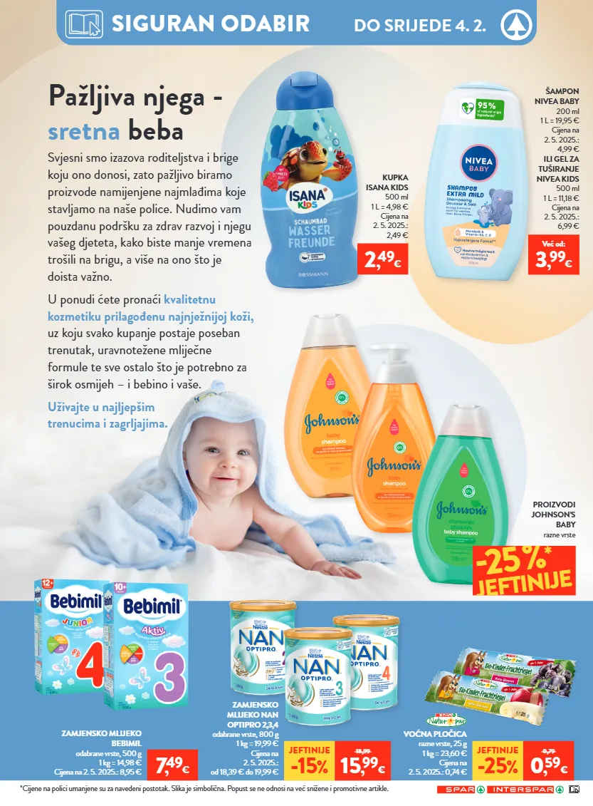 pažljiva njega - sretna beba svjesni smo izazova roditeljstva i brige koju ono donosi, zato pažljivo biramo proizvode namijenjene najmlađima koje stavljamo na naše police. nudimo vam pouzdanu podršku za zdrav razvoj i njegu vašeg djeteta, kako biste manje vremena trošili na brigu, a više na ono što je doista važno. u ponudi ćete pronaći kvalitetnu kozmetiku prilagođenu najnježnijoj koži, uz koju svako kupanje postaje poseban trenutak, uravnotežene mliječne formule te sve ostalo što je potrebno za širok osmijeh – i bebino i vaše. uživajte u najljepšim trenucima i zagrljajima. proizvodi johnson’s baby razne vrste -25 % * jeftinije kupka isana kids 500 ml 1 l = 4,98 € cijena na 2. 5. 2025.: 2,49 € 2 , 49 € zamjensko mlijeko nan optipro 2,3,4 odabrane vrste, 800 g 1 kg = 19,99 € cijena na 2. 5. 2025.: od 18,39 € do 19,99 € jeftinije -15 % 18,99 15 , 99 € zamjensko mlijeko bebimil odabrane vrste, 500 g 1 kg = 14,98 € cijena na 2. 5. 2025.: 8,95 € voćna pločica razne vrste, 25 g 1 kg = 23,60 € cijena na 2. 5. 2025.: 0,74 € jeftinije -25 % 0,79 0 , 59 € 7 , 49 € šampon nivea baby 200 ml 1 l = 19,95 € cijena na 2. 5. 2025.: 4,99 € ili gel za tuširanje nivea kids 500 ml 1 l = 11,18 € cijena na 2. 5. 2025.: 6,99 € već od: 3 , 99 € *cijene na polici umanjene su za navedeni postotak. slika je simbolična. popust se ne odnosi na već snižene i promotivne artikle. do srijede 4. 2. siguran odabir