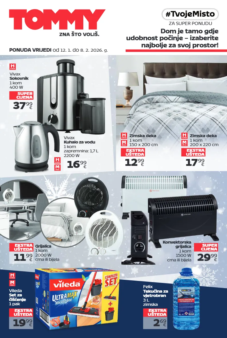 ponuda vrijedi od 12. 1. do 8. 2. 2026. g. za super ponudu dom je tamo gdje udobnost počinje – izaberite najbolje za svoj prostor! 37 99 € vivax sokovnik 1 kom 400 w super cijena 12 99 € ekstra ušteda 17 99 € ekstra ušteda zimska deka 1 kom 150 x 200 cm zimska deka 1 kom 200 x 220 cm 2 69 € felix tekućina za vjetrobran 3 l zimska ekstra ušteda 11 99 € grijalica 1 kom 2000 w crna ili bijela ekstra ušteda 19 99 € vileda set za čišćenje 1 pak ekstra ušteda 16 99 € vivax kuhalo za vodu 1 kom zapremnina: 1,7 l 2200 w 29 99 € konvektorska grijalica 1 kom 1500 w crna ili bijela super cijena