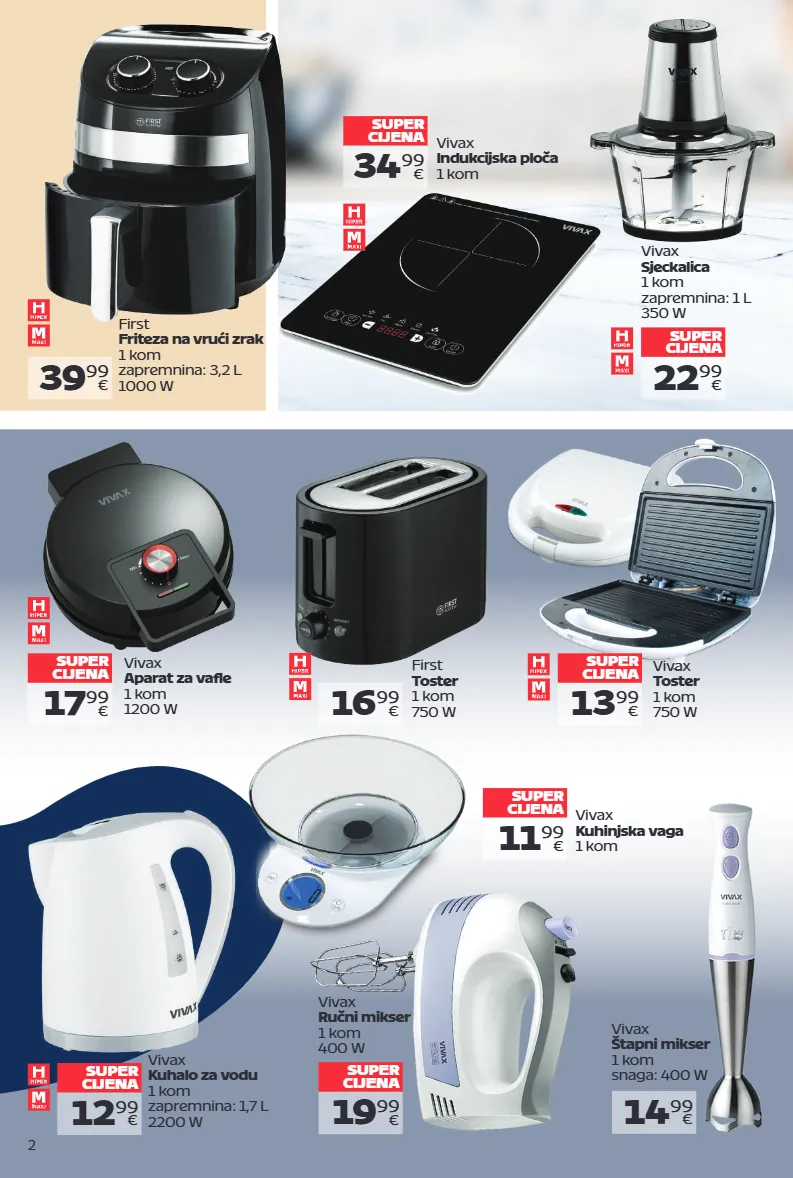 2 22 99 € vivax sjeckalica 1 kom zapremnina: 1 l 350 w super cijena 11 99 € vivax kuhinjska vaga 1 kom super cijena 34 99 € vivax indukcijska ploča 1 kom super cijena 39 99 € first friteza na vrući zrak 1 kom zapremnina: 3,2 l 1000 w 19 99 € vivax ručni mikser 1 kom 400 w super cijena 12 99 € vivax kuhalo za vodu 1 kom zapremnina: 1,7 l 2200 w super cijena 13 99 € vivax toster 1 kom 750 w super cijena 16 99 € first toster 1 kom 750 w 17 99 € vivax aparat za vafle 1 kom 1200 w super cijena 14 99 € vivax štapni mikser 1 kom snaga: 400 w