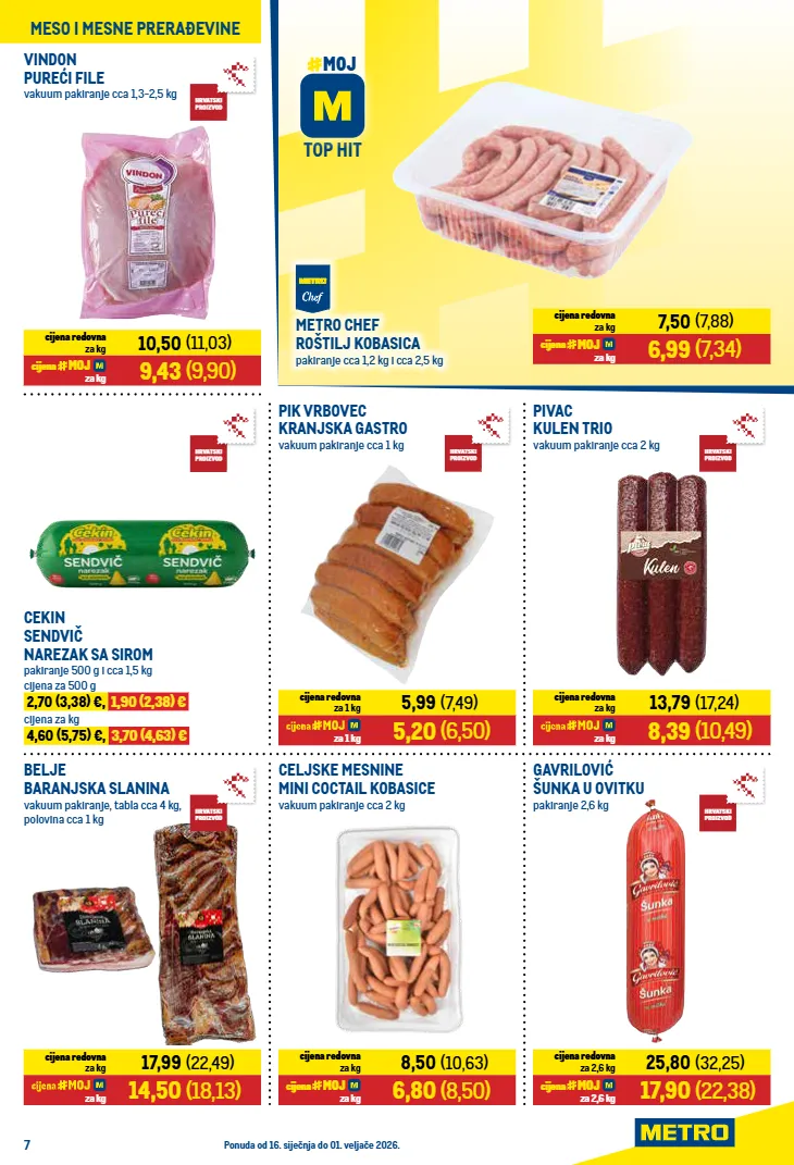 7 ponuda od 16. siječnja do 01. veljače 2026. pivac kulen trio vakuum pakiranje cca 2 kg metro chef roštilj kobasica pakiranje cca 1,2 kg i cca 2,5 kg celjske mesnine mini coctail kobasice vakuum pakiranje cca 2 kg cekin sendvič narezak sa sirom pakiranje 500 g i cca 1,5 kg cijena za 500 g 2,70 (3,38) €, 1,90 (2,38) € cijena za kg 4,60 (5,75) €, 3,70 (4,63) € gavrilović šunka u ovitku pakiranje 2,6 kg vindon pureći file vakuum pakiranje cca 1,3-2,5 kg pik vrbovec kranjska gastro vakuum pakiranje cca 1 kg belje baranjska slanina vakuum pakiranje, tabla cca 4 kg, polovina cca 1 kg top hit moj cijena redovna za kg 17,99 (22,49) za kg 14,50 (18,13) cijena redovna za kg 8,50 (10,63) cijena moj za kg 6,80 (8,50) cijena redovna za kg 7,50 (7,88) cijena moj za kg 6,99 (7,34) cijena redovna za 1 kg 5,99 (7,49) za 1 kg 5,20 (6,50) cijena redovna za kg 10,50 (11,03) cijena moj za kg 9,43 (9,90) meso i mesne prerađevine hrvatski proizvod hrvatski proizvod hrvatski proizvod hrvatski proizvod cijena redovna za kg 13,79 (17,24) za kg 8,39 (10,49) hrvatski proizvod hrvatski proizvod hrvatski proizvod hrvatski proizvod hrvatski proizvod hrvatski proizvod cijena redovna za 2,6 kg 25,80 (32,25) cijena moj za 2,6 kg 17,90 (22,38) hrvatski proizvod hrvatski proizvod