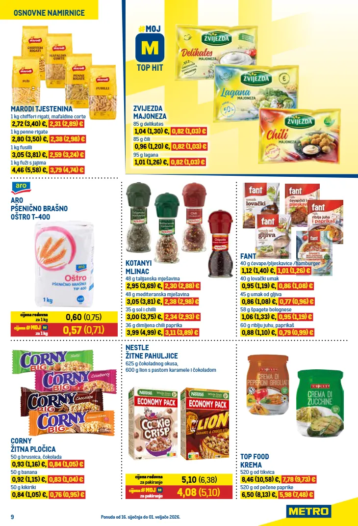 9 ponuda od 16. siječnja do 01. veljače 2026. fant 40 g ćevape/pljeskavice /hamburger 1,12 (1,40) €, 1,01 (1,26) € 40 g lovački umak 0,95 (1,19) €, 0,86 (1,08) € 45 g umak od gljiva 0,86 (1,08) €, 0,77 (0,96) € 58 g špagete bolognese 1,06 (1,33) €, 0,95 (1,19) € 60 g riblju juhu, paprikaš 0,88 (1,10) €, 0,79 (0,99) € aro pšenično brašno oštro t-400 zvijezda majoneza 85 g delikates 1,04 (1,30) €, 0,82 (1,03) € 85 g čili 0,96 (1,20) €, 0,82 (1,03) € 95 g lagana 1,01 (1,26) €, 0,82 (1,03) € kotanyi mlinac 48 g talijanska mješavina 2,95 (3,69) €, 2,30 (2,88) € 48 g mediteranska mješavina 3,05 (3,81) €, 2,38 (2,98) € 35 g sol i chilli 3,00 (3,75) €, 2,34 (2,93) € 36 g dimljena chili paprika 3,99 (4,99) €, 3,11 (3,89) € corny žitna pločica 50 g brusnica, čokolada 0,93 (1,16) €, 0,84 (1,05) € 50 g banana 0,92 (1,15) €, 0,83 (1,04) € 50 g kikiriki 0,84 (1,05) €, 0,76 (0,95) € top food krema 520 g od tikvica 8,46 (10,58) €, 7,78 (9,73) € 520 g od pečene paprike 6,50 (8,13) €, 5,98 (7,48) € marodi tjestenina 1 kg chifferi rigati, mafaldine corte 2,72 (3,40) €, 2,31 (2,89) € 1 kg penne rigate 2,80 (3,50) €, 2,38 (2,98) € 1 kg fusilli 3,05 (3,81) €, 2,59 (3,24) € 1 kg fuži s jajima 4,46 (5,58) €, 3,79 (4,74) € nestle žitne pahuljice 625 g čokoladnog okusa, 600 g lion s pastom karamele i čokoladom top hit moj cijena redovna za pakiranje 5,10 (6,38) cijena moj za pakiranje 4,08 (5,10) cijena redovna za 1 kg 0,60 (0,75) cijena moj za 1 kg 0,57 (0,71) osnovne namirnice