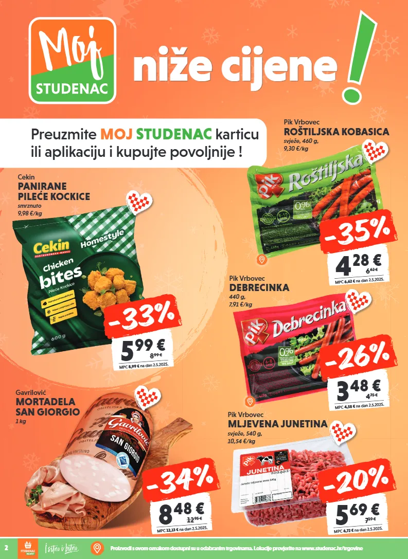 preuzmite moj studenac karticu ili aplikaciju i kupujte povoljnije ! 2 proizvodi s ovom oznakom dostupni su u odabranim trgovinama. lokacije provjerite na www.studenac.hr/trgovine gavrilović mortadela san giorgio 1 kg 8 , 48 € mpc 12,13 € na dan 2.5.2025. 12, 95 € -34% pik vrbovec roštiljska kobasica svježe, 460 g, 9,30 €/kg 4 , 28 € mpc 6,62 € na dan 2.5.2025. 6, 62 € -35% cekin panirane pileće kockice smrznuto 9,98 €/kg 5 , 99 € mpc 8,99 € na dan 2.5.2025. 8, 99 € -33% pik vrbovec debrecinka 440 g, 7,91 €/kg 3 , 48 € mpc 4,58 € na dan 2.5.2025. 4, 75 € -26% pik vrbovec mljevena junetina svježe, 540 g, 10,54 €/kg 5 , 69 € mpc 6,72 € na dan 2.5.2025. 7, 19 € -20% niže cijene