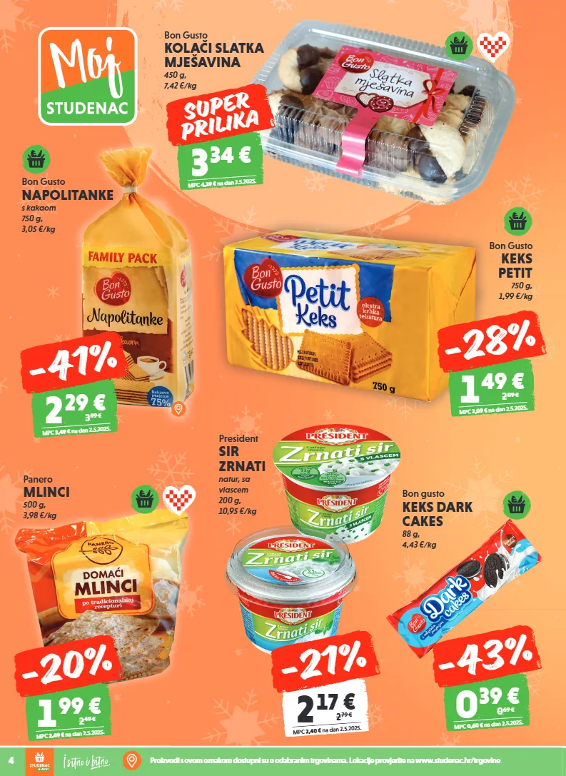4 proizvodi s ovom oznakom dostupni su u odabranim trgovinama. lokacije provjerite na www.studenac.hr/trgovine panero mlinci 500 g, 3,98 €/kg 1 , 99 € mpc 2,49 € na dan 2.5.2025. 2, 49 € -20% bon gusto kolači slatka mješavina 450 g, 7,42 €/kg bon gusto keks petit 750 g, 1,99 €/kg 1 , 49 € mpc 2,09 € na dan 2.5.2025. 2 09 € -28% bon gusto keks dark cakes 88 g, 4,43 €/kg 0 , 39 € mpc 0,60 € na dan 2.5.2025. 0, 69 € -43% bon gusto napolitanke s kakaom 750 g, 3,05 €/kg 2 , 29 € mpc 3,49 € na dan 2.5.2025. 3, 89 € -41% president sir zrnati natur, sa vlascem 200 g, 10,95 €/kg 3 34 € mpc 4,19 € na dan 2.5.2025. super prilika 2 , 17 € mpc 2,40 € na dan 2.5.2025. 2, 79 € -21%