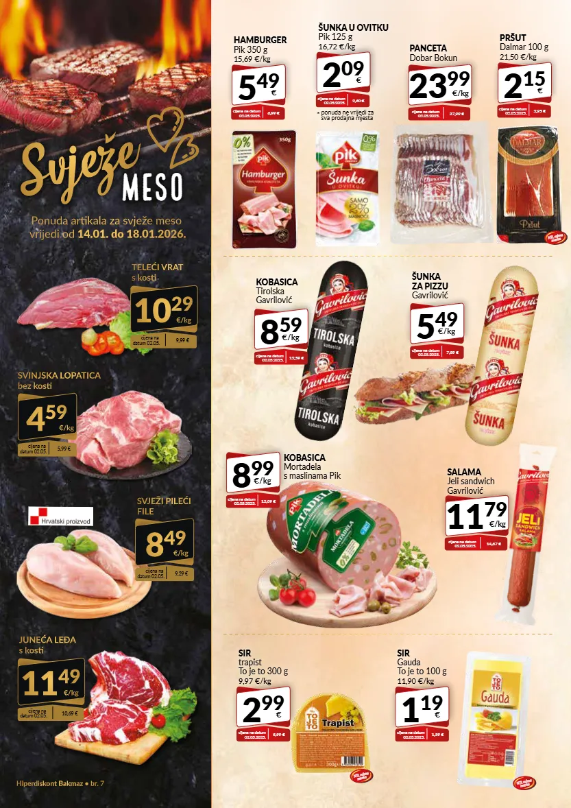 hiperdiskont bakmaz • br. 7 ponuda artikala za svježe meso vrijedi od 14.01. do 18.01.2026. svježe meso 8 99 €/kg cijena na datum 02.05.2025. 12,39 € kobasica mortadela s maslinama pik 2 09 € šunka u ovitku pik 125 g 16,72 €/kg cijena na datum 02.05.2025. 2,60 € * ponuda ne vrijedi za sva prodajna mjesta 5 49 € hamburger pik 350 g 15,69 €/kg cijena na datum 02.05.2025. 6,99 € 2 15 € pršut dalmar 100 g 21,50 €/kg cijena na datum 02.05.2025. 2,95 € 11 79 €/kg cijena na datum 02.05.2025. 14,67 € salama jeli sandwich gavrilović ntl robna marka panceta dobar bokun 23 99 €/kg cijena na datum 02.05.2025. 27,99 € 1 19 € sir gauda to je to 100 g 11,90 €/kg cijena na datum 02.05.2025. 1,59 € 2 99 € sir trapist to je to 300 g 9,97 €/kg cijena na datum 02.05.2025. 3,99 € ntl robna marka ntl robna marka juneća leđa s kosti 11 49 €/kg cijena na datum 02.05. 10,69 € teleći vrat s kosti 10 29 €/kg cijena na datum 02.05. 9,99 € 4 59 €/kg svinjska lopatica bez kosti cijena na datum 02.05. 5,99 € 8 49 €/kg svježi pileći file cijena na datum 02.05. 9,29 € 5 49 €/kg cijena na datum 02.05.2025. 7,39 € šunka za pizzu gavrilović 8 59 €/kg cijena na datum 02.05.2025. 12,59 € kobasica tirolska gavrilović