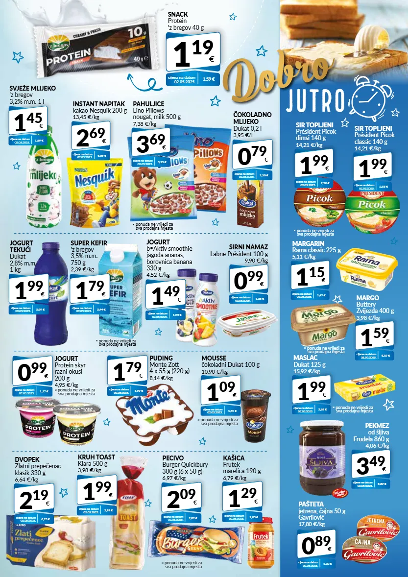 pekmez od šljiva frudela 860 g 4,06 €/kg 3 49 € cijena na datum 02.05.2025. 3,89 € jogurt tekući dukat 2,8% m.m. 1 kg 1 99 € cijena na datum 02.05.2025. 2,39 € super kefir 'z bregov 3,5% m.m. 750 g 2,39 €/kg 1 79 € cijena na datum 02.05.2025. 2,44 € * ponuda ne vrijedi za sva prodajna mjesta jogurt b�aktiv smoothie jagoda ananas, borovnica banana 330 g 4,52 €/kg 1 49 € cijena na datum 02.05.2025. 1,95 € jogurt protein skyr razni okusi 200 g 4,95 €/kg 0 99 € cijena na datum 02.05.2025. 1,57 € * ponuda ne vrijedi za sva prodajna mjesta puding monte zott 4 x 55 g (220 g) 8,14 €/kg 1 79 € cijena na datum 02.05.2025. 1,99 € kašica frutek marelica 190 g 6,79 €/kg 1 29 € cijena na datum 02.05.2025. 1,95 € pecivo burger quickbury 300 g (6 x 50 g) 6,97 €/kg 2 09 € cijena na datum 02.05.2025. 2,82 € mousse čokoladni dukat 100 g 10,90 €/kg 1 09 € cijena na datum 02.05.2025. 1,39 € * ponuda ne vrijedi za sva prodajna mjesta dvopek zlatni prepečenac klasik 330 g 6,64 €/kg 2 19 € cijena na datum 02.05.2025. 3,25 € kruh toast klara 500 g 3,98 €/kg 1 99 € cijena na datum 02.05.2025. 2,99 € sirni namaz labne président 100 g 9,90 €/kg 0 99 € cijena na datum 02.05.2025. 1,25 € sir topljeni président picok classic 140 g 14,21 €/kg 1 99 € cijena na datum 02.05.2025. 2,35 € sir topljeni président picok dimsi 140 g 14,21 €/kg 1 99 € cijena na datum 02.05.2025. 2,29 € * ponuda ne vrijedi za sva prodajna mjesta margarin rama classic 225 g 5,11 €/kg 1 15 € cijena na datum 02.05.2025. 1,47 € maslac dukat 125 g 15,92 €/kg 1 99 € cijena na datum 02.05.2025. 2,65 € * ponuda ne vrijedi za sva prodajna mjesta margo buttery zvijezda 400 g 3,98 €/kg 1 59 € cijena na datum 23.09.2025. 3,19 € * ponuda ne vrijedi za sva prodajna mjesta pašteta jetrena, čajna 50 g gavrilović 17,80 €/kg 0 89 € cijena na datum 02.05.2025. 1,22 € 1 19 € snack protein 'z bregov 40 g cijena na datum 02.05.2025. 1,59 € pahuljice lino pillows nougat, milk 500 g 7,38 €/kg 3 69 € cijena na datum 02.05.2025. 5,55 € * ponuda ne vrijedi za sva prodajna mjesta čokoladno mlijeko dukat 0,2 l 3,95 €/l 0 79 € cijena na datum 02.05.2025. 1,10 € instant napitak kakao nesquik 200 g 13,45 €/kg 2 69 € cijena na datum 02.05.2025. 3,85 € dobro jutro svježe mlijeko 'z bregov 3,2% m.m. 1 l 1 45 € cijena na datum 02.05.2025. 1,69 € ntl robna marka * ponuda ne vrijedi za sva prodajna mjesta