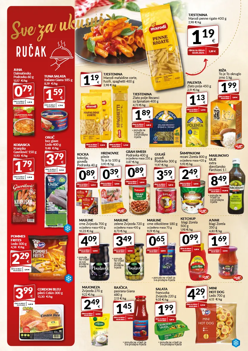 sve za ukusni ručak tjestenina marodi penne rigate 400 g 2,98 €/kg 1 19 € cijena na datum 02.05.2025. 1,89 € 2 49 € šampinjoni rezani zorela 800 g ocijeđena masa 420 g 5,93 €/kg cijena na datum 02.05.2025. 2,99 € 3 59 € gulaš goveđi podravka 300 g 11,97 €/kg cijena na datum 02.05.2025. 4,39 € 0 89 € grah smeđi podravka 400 g ocijeđena masa 230 g 3,87 €/kg cijena na datum 02.05.2025. 1,39 € 0 89 € kocka kokošja, goveđa podravka 40 g cijena na datum 02.05.2025. 1,35 € 1 69 € ajvar blagi zorela 350 g 4,83 €/kg cijena na datum 02.05.2025. 2,19 € 2 49 € majoneza zvijezda 270 g 9,22 €/kg cijena na datum 02.05.2025. 3,55 € 0 99 € ketchup blagi zorela 500 g 1,98 €/kg cijena na datum 02.05.2025. 1,33 € 1 99 € riža to je to okruglo zrno 1 kg cijena na datum 02.05.2025. 2,49 € 1 19 € tjestenina marodi mafaldine corte, fusilli, spaghetti 400 g 2,98 €/kg cijena na datum 02.05.2025. 1,55 € 1 13 € palenta zlato polje 450 g 2,51 €/kg cijena na datum 02.05.2025. 2,19 € cijena na datum 02.05.2025. 1,70 € 0 65 € masline crne otkošćene 180 g ocijeđena masa 70 g 9,29 €/kg cijena na datum 26.06.2025. 0,89 € * ponuda ne vrijedi za sva prodajna mjesta * ponuda ne vrijedi za sva prodajna mjesta * ponuda ne vrijedi za sva prodajna mjesta 1 45 € rajčica pasirana giana 680 g 2,13 €/kg cijena na datum 02.05.2025. 1,57 € * ponuda ne vrijedi za sva prodajna mjesta 4 09 € masline crne zvijezda 700 g ocijeđena masa 400 g 10,23 €/kg cijena na datum 02.05.2025. 4,85 € 3 49 € masline zelene zvijezda 720 g ocijeđena masa 400 g 8,73 €/kg cijena na datum 02.05.2025. 4,55 € cijena na datum 02.05.2025. 2,89 € 1 89 € tjestenina zlato polje rezanci sa špinatom 400 g 4,73 €/kg * ponuda ne vrijedi za sva prodajna mjesta juha dalmatinska podravka 60 g 13,17 €/kg 0 79 € cijena na datum 02.05.2025. 1,09 € tuna salata italiano giana 185 g 8,59 €/kg 1 59 € cijena na datum 02.05.2025. 1,79 € mini hot dog ledo 700 g 6,13 €/kg 4 29 € cijena na datum 02.05.2025. 5,79 € oslić bez glave ledo 400 g 9,48 €/kg 3 79 € cijena na datum 02.05.2025. 3,90 € cordon bleu pileći cekin 300 g 13,30 €/kg 3 99 € cijena na datum 02.05.2025. 4,69 € kobasica kranjska gavrilović 150 g 11,93 €/kg 1 79 € cijena na datum 02.05.2025. 2,39 € pommes frites ledo 500 g 4,58 €/kg 2 29 € cijena na datum 30.06.2025. 2,90 € 8 49 € maslinovo ulje extra djevičansko farchioni 1 l cijena na datum 02.05.2025. 14,49 € * ponuda ne vrijedi za sva prodajna mjesta 1 99 € salata francuska zvijezda 220 g 9,05 €/kg cijena na datum 02.05.2025. 2,69 € * ponuda ne vrijedi za sva prodajna mjesta ntl robna marka ntl robna marka ntl robna marka ntl robna marka 0 39 € hrenovke pileće to je to 100 g 3,90 €/kg cijena na datum 02.05.2025. 0,53 € ntl robna marka