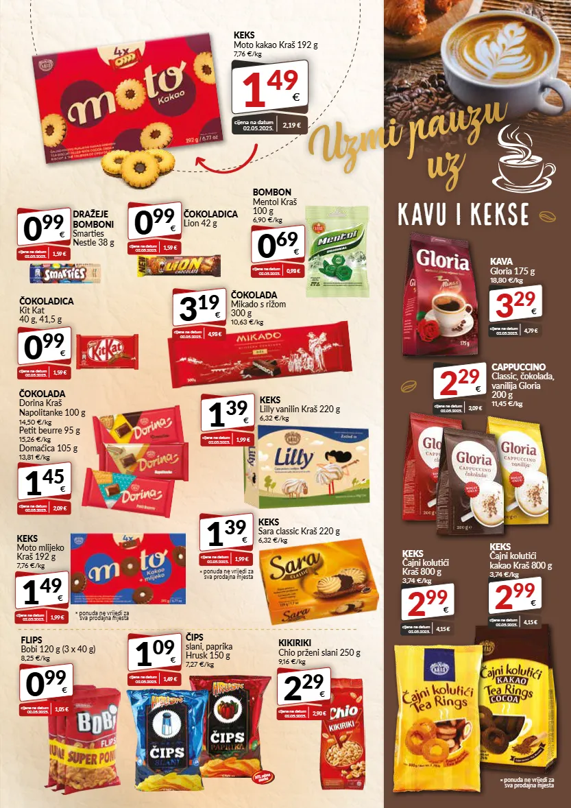 kavu i kekse uzmi pauzu uz 3 29 € kava gloria 175 g 18,80 €/kg cijena na datum 02.05.2025. 4,79 € 2 29 € cappuccino classic, čokolada, vanilija gloria 200 g 11,45 €/kg cijena na datum 02.05.2025. 3,09 € 1 49 € keks moto kakao kraš 192 g 7,76 €/kg cijena na datum 02.05.2025. 2,19 € 1 09 € čips slani, paprika hrusk 150 g 7,27 €/kg cijena na datum 02.05.2025. 1,49 € 2 29 € kikiriki chio prženi slani 250 g 9,16 €/kg cijena na datum 02.05.2025. 2,90 € 0 99 € flips bobi 120 g (3 x 40 g) 8,25 €/kg cijena na datum 02.05.2025. 1,05 € 1 39 € keks sara classic kraš 220 g 6,32 €/kg cijena na datum 02.05.2025. 1,99 € 1 39 € keks lilly vanilin kraš 220 g 6,32 €/kg cijena na datum 02.05.2025. 1,99 € 0 69 € bombon mentol kraš 100 g 6,90 €/kg cijena na datum 02.05.2025. 0,98 € 0 99 € dražeje bomboni smarties nestle 38 g cijena na datum 02.05.2025. 1,59 € 0 99 € čokoladica lion 42 g cijena na datum 02.05.2025. 1,59 € 0 99 € čokoladica kit kat 40 g, 41,5 g cijena na datum 02.05.2025. 1,59 € 1 45 € čokolada dorina kraš napolitanke 100 g 14,50 €/kg petit beurre 95 g 15,26 €/kg domaćica 105 g 13,81 €/kg cijena na datum 02.05.2025. 2,09 € 3 19 € čokolada mikado s rižom 300 g 10,63 €/kg cijena na datum 02.05.2025. 4,98 € 1 49 € keks moto mlijeko kraš 192 g 7,76 €/kg cijena na datum 02.05.2025. 1,99 € * ponuda ne vrijedi za sva prodajna mjesta * ponuda ne vrijedi za sva prodajna mjesta ntl robna marka 2 99 € keks čajni kolutići kraš 800 g 3,74 €/kg cijena na datum 02.05.2025. 4,15 € 2 99 € keks čajni kolutići kakao kraš 800 g 3,74 €/kg cijena na datum 02.05.2025. 4,15 € * ponuda ne vrijedi za sva prodajna mjesta