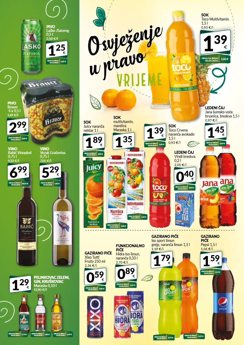 sok toco multivitamin 1,5 l 0,93 €/l 1 39 € cijena na datum 02.05.2025. 1,85 € osvježenje u pravo vrijeme 1 29 € pelinkovac zeleni, gin, kruškovac maraska 0,10 l 12,90 €/l cijena na datum 02.05.2025. 1,75 € cijena na datum 02.05.2025. 1,82 € cijena na datum 02.05.2025. 1,79 € 1 25 € pivo laško zlatorog 0,5 l 2,50 €/l cijena na datum 02.05.2025. 1,69 € 2 99 € pivo brauer 4 x 0,5 l 1,49 €/l cijena na datum 02.05.2025. 3,81 € 6 99 € vino babić vinoplod 0,75 l 9,32 €/l cijena na datum 02.05.2025. 10,52 € 5 29 € vino vezak graševina 0,75 l 7,05 €/l cijena na datum 02.05.2025. 7,32 € 1 45 € ledeni čaj jana šumsko voće brusnica, breskva 1,5 l 0,97 €/l cijena na datum 02.05.2025. 1,99 € 0 59 € gazirano piće xixo tutti fruity 250 ml 2,36 €/l cijena na datum 02.05.2025. 0,82 € 1 39 € sok toco crvena naranča avokado 1,5 l 0,93 €/l cijena na datum 02.05.2025. 1,85 € 1 59 € gazirano piće pepsi 1,5 l 1,06 €/l cijena na datum 02.05.2025. 2,15 € 1 89 € sok juicy naranča nektar 1 l cijena na datum 02.05.2025. 2,82 € 0 40 € ledeni čaj vindi breskva 0,2 l 2,00 €/l cijena na datum 02.05.2025. 0,60 € 1 79 € gazirano piće iso sport limun grejp, naranča limun 1,5 l 1,19 €/l cijena na datum 02.05.2025. 2,75 € cijena na datum 02.05.2025. 2,79 € 0 89 € funkcionalno piće hidra iso limun, naranča 0,33 l 2,70 €/l cijena na datum 02.05.2025. 1,07 € 1 35 € sok multivitamin, marelica maraska 1 l cijena na datum 02.05.2025. 1,85 € cijena na datum 02.05.2025. 1,79 €