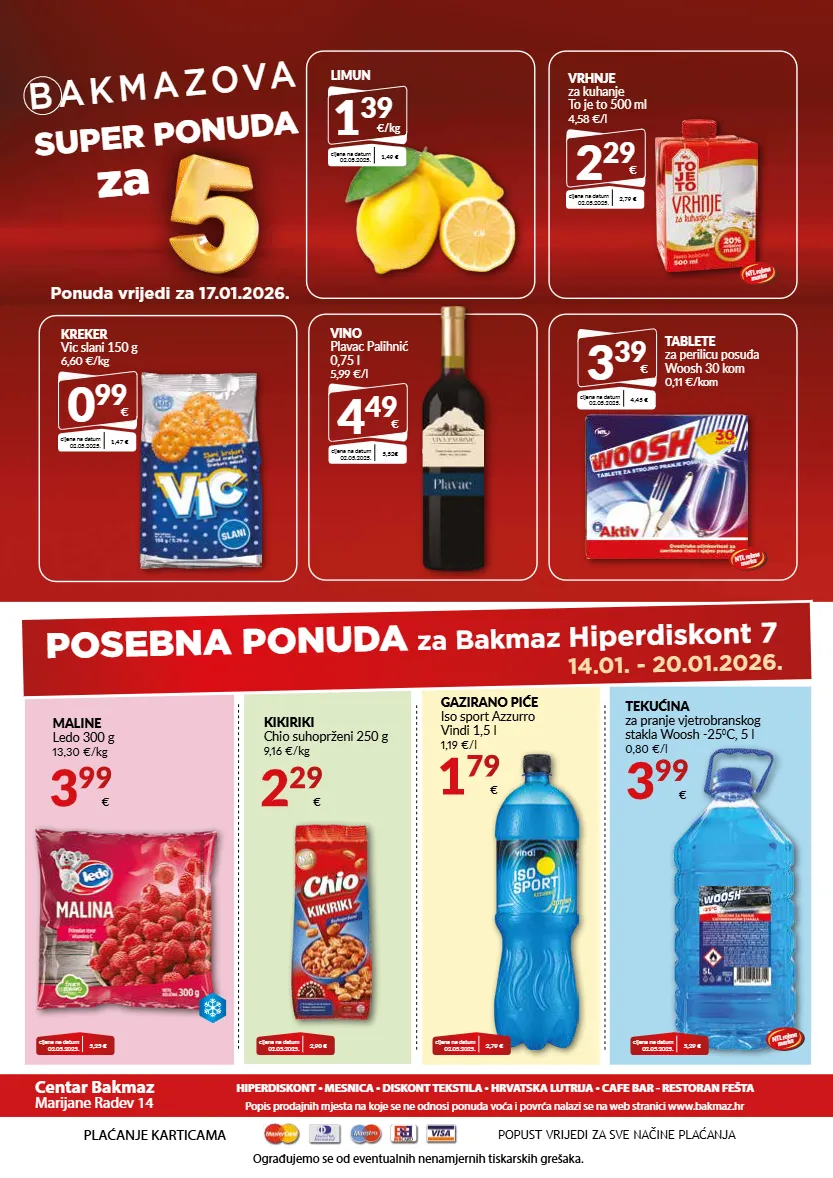 b a k m a z o va super ponuda za ponuda vrijedi za 17.01.2026. kapsule macchiato, cappuccino franck 198 g 161,56 kn/kg 21,44 €/kg 31 99 kn 4,25 € plaćanje karticama ograđujemo se od eventualnih nenamjernih tiskarskih grešaka. popust vrijedi za sve načine plaćanja centar bakmaz marijane radev 14 hiperdiskont • mesnica • diskont tekstila • hrvatska lutrija • cafe bar - restoran fešta popis prodajnih mjesta na koje se ne odnosi ponuda voća i povrća nalazi se na web stranici www.bakmaz.hr 14.01. - 20.01.2026. posebna ponuda za bakmaz hiperdiskont 7 maline ledo 300 g 13,30 €/kg 3 99 € kikiriki chio suhoprženi 250 g 9,16 €/kg 2 29 € gazirano piće iso sport azzurro vindi 1,5 l 1,19 €/l 1 79 € tekućina za pranje vjetrobranskog stakla woosh -25 0 c, 5 l 0,80 €/l 3 99 € kreker vic slani 150 g 6,60 €/kg 0 99 € cijena na datum 02.05.2025. 1,47 € vino plavac palihnić 0,75 l 5,99 €/l 4 49 € cijena na datum 02.05.2025. 5,52€ cijena na datum 02.05.2025. 5,25 € cijena na datum 02.05.2025. 2,90 € limun 1 39 €/kg cijena na datum 02.05.2025. 1,49 € vrhnje za kuhanje to je to 500 ml 4,58 €/l 2 29 € cijena na datum 02.05.2025. 2,79 € tablete za perilicu posuđa woosh 30 kom 0,11 €/kom 3 39 € cijena na datum 02.05.2025. 4,45 € cijena na datum 02.05.2025. 2,79 € cijena na datum 02.05.2025. 5,29 € ntl robna marka ntl robna marka ntl robna marka