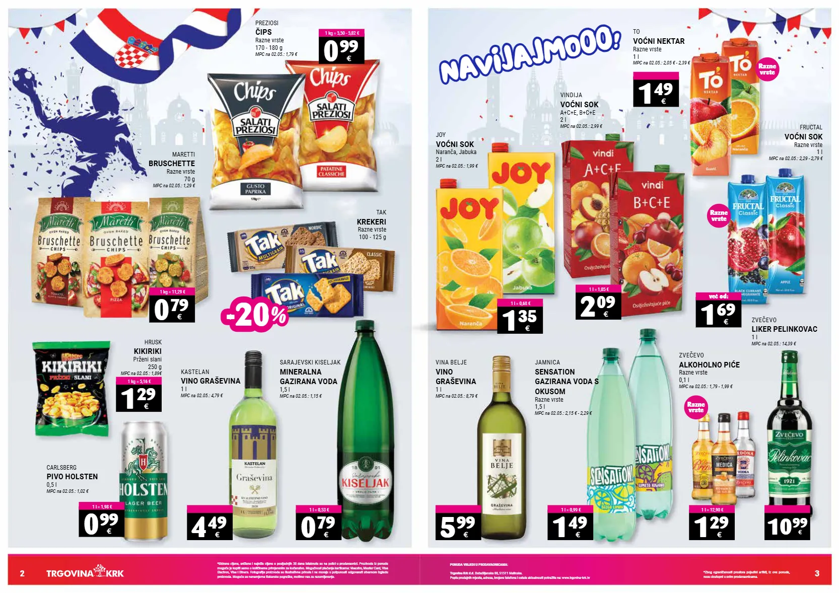 *sidrene cijene, snižene i najniže cijene u posljednjih 30 dana istaknute su na polici u prodavaonici. prozivode iz ponude moguće je kupiti samo u količinama primjerenim za kućanstvo. mogućnost plaćanja karticama: maestro, master card, visa electron, visa i diners. fotografije proizvoda su ilustrativne prirode i ne moraju u potpunosti odgovarati stvarnom izgledu proizvoda. moguće su nenamjerne tiskarske pogreške, molimo vas za razumijevanje. ponuda vrijedi u prodavaonicama: trgovina krk d.d. dubašljanska 80, 51511 malinska. popis prodajnih mjesta, adresa, brojeve telefona i ostale aktualnosti potražite na: www.trgovina-krk.hr *zbog ograničenosti prostora pojedini artikli, iz ove ponude, nosu dostupni u svim prodavaonicama. 3 2 preziosi čips razne vrste 170 - 180 g mpc na 02.05.: 1,79 € 0 99 € 1 kg = 5,50 - 5,82 € 1 29 € 1 kg = 5,16 € 0 79 € 1 kg = 11,29 € 0 99 € 1 l = 1,98 € 4 49 € 1 35 € 1 l = 0,68 € 2 09 € 1 l = 1,05 € 1 49 € 1 l = 0,99 € 1 29 € 1 l = 12,90 € 0 79 € 1 l = 0,53 € navijajmo00! navijajmo00! hrusk kikiriki prženi slani 250 g mpc na 02.05.: 1,89€ maretti bruschette razne vrste 70 g mpc na 02.05.: 1,29 € tak krekeri razne vrste 100 - 125 g -20 -20 % % carlsberg pivo holsten 0,5 l mpc na 02.05.: 1,02 € kastelan vino graševina 1 l mpc na 02.05.: 4,79 € to voćni nektar razne vrste 1 l mpc na 02.05.: 2,05 € - 2,39 € joy voćni sok naranča, jabuka 2 l mpc na 02.05.: 1,99 € vindija voćni sok a+c+e, b+c+e 2 l mpc na 02.05.: 2,99 € zvečevo liker pelinkovac 1 l mpc na 02.05.: 14,39 € jamnica sensation gazirana voda s okusom razne vrste 1,5 l mpc na 02.05.: 2,15 € - 2,29 € zvečevo alkoholno piće razne vrste 0,1 l mpc na 02.05.: 1,79 - 1,99 € 1 49 € 10 99 € fructal voćni sok razne vrste 1 l mpc na 02.05.: 2,29 - 2,79 € 1 69 € već od: sarajevski kiseljak mineralna gazirana voda 1,5 l mpc na 02.05.: 1,15 € vina belje vino graševina 1 l mpc na 02.05.: 8,79 € 5 99 € razne vrste razne vrste razne vrste