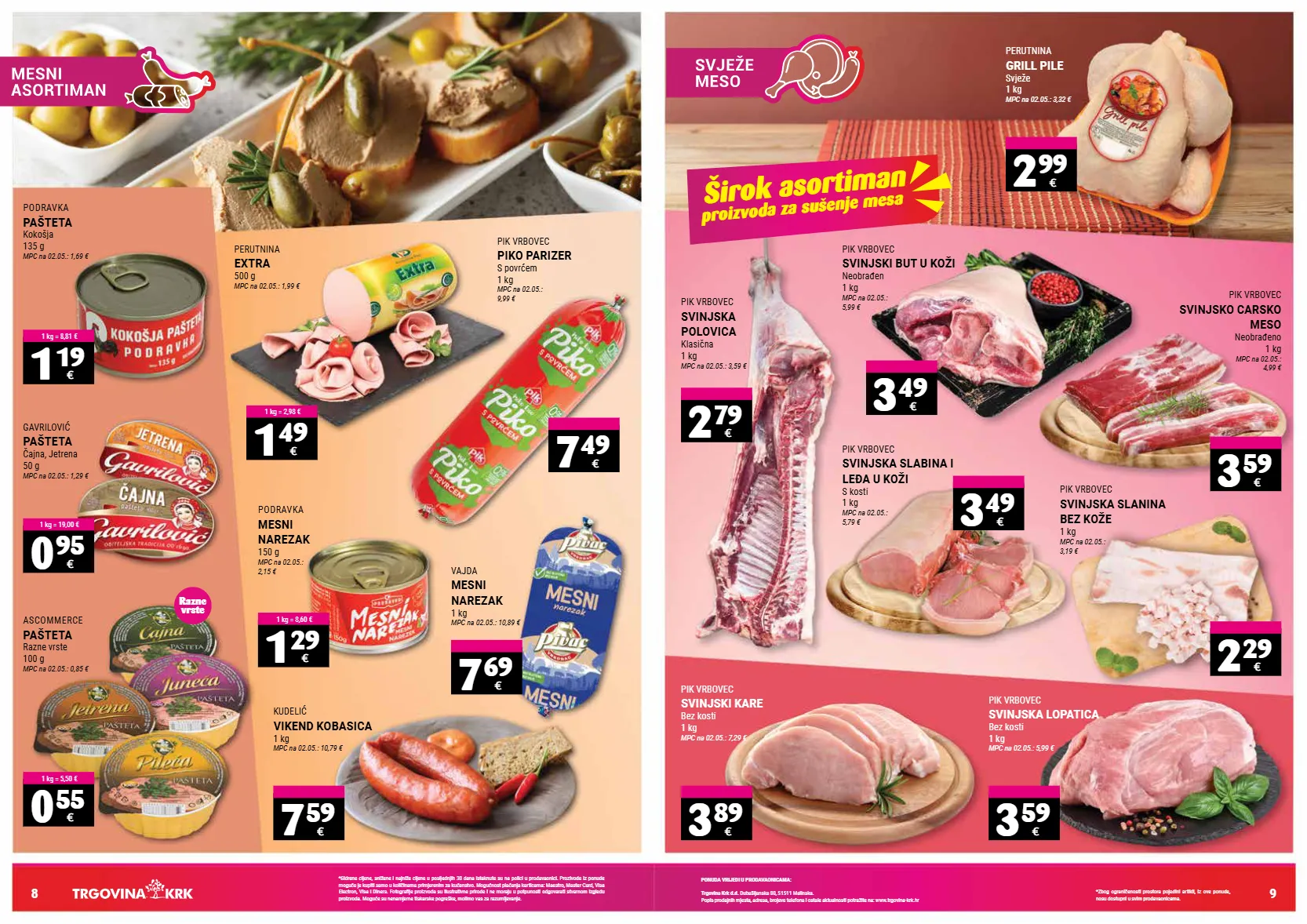 *sidrene cijene, snižene i najniže cijene u posljednjih 30 dana istaknute su na polici u prodavaonici. prozivode iz ponude moguće je kupiti samo u količinama primjerenim za kućanstvo. mogućnost plaćanja karticama: maestro, master card, visa electron, visa i diners. fotografije proizvoda su ilustrativne prirode i ne moraju u potpunosti odgovarati stvarnom izgledu proizvoda. moguće su nenamjerne tiskarske pogreške, molimo vas za razumijevanje. ponuda vrijedi u prodavaonicama: trgovina krk d.d. dubašljanska 80, 51511 malinska. popis prodajnih mjesta, adresa, brojeve telefona i ostale aktualnosti potražite na: www.trgovina-krk.hr *zbog ograničenosti prostora pojedini artikli, iz ove ponude, nosu dostupni u svim prodavaonicama. 9 8 7 59 € kudelić vikend kobasica 1 kg mpc na 02.05.: 10,79 € perutnina extra 500 g mpc na 02.05.: 1,99 € gavrilović pašteta čajna, jetrena 50 g mpc na 02.05.: 1,29 € podravka mesni narezak 150 g mpc na 02.05.: 2,15 € podravka pašteta kokošja 135 g mpc na 02.05.: 1,69 € ascommerce pašteta razne vrste 100 g mpc na 02.05.: 0,85 € 1 49 € 1 kg = 2,98 € 0 95 € 1 kg = 19,00 € 1 29 € 1 kg = 8,60 € 1 19 € 1 kg = 8,81 € 0 55 € 1 kg = 5,50 € 7 69 € vajda mesni narezak 1 kg mpc na 02.05.: 10,89 € 7 49 € pik vrbovec piko parizer s povrćem 1 kg mpc na 02.05.: 9,99 € razne vrste širok asortiman proizvoda za sušenje mesa pik vrbovec svinjski kare bez kosti 1 kg mpc na 02.05.: 7,29 € pik vrbovec svinjska lopatica bez kosti 1 kg mpc na 02.05.: 5,99 € pik vrbovec svinjsko carsko meso neobrađeno 1 kg mpc na 02.05.: 4,99 € pik vrbovec svinjska polovica klasična 1 kg mpc na 02.05.: 3,59 € pik vrbovec svinjski but u koži neobrađen 1 kg mpc na 02.05.: 5,99 € pik vrbovec svinjska slabina i leđa u koži s kosti 1 kg mpc na 02.05.: 5,79 € pik vrbovec svinjska slanina bez kože 1 kg mpc na 02.05.: 3,19 € 3 89 € 3 59 € 3 59 € 2 79 € 3 49 € 3 49 € 2 29 € perutnina grill pile svježe 1 kg mpc na 02.05.: 3,32 € 2 99 €
