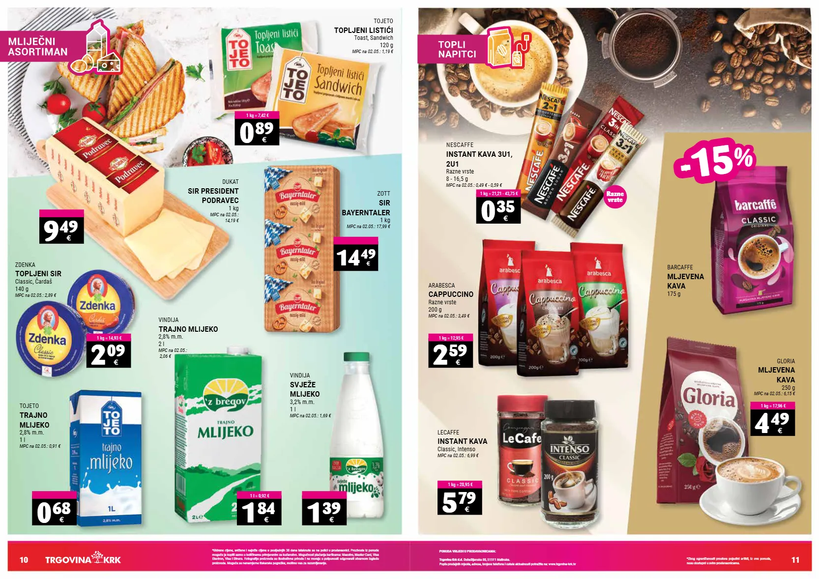 *sidrene cijene, snižene i najniže cijene u posljednjih 30 dana istaknute su na polici u prodavaonici. prozivode iz ponude moguće je kupiti samo u količinama primjerenim za kućanstvo. mogućnost plaćanja karticama: maestro, master card, visa electron, visa i diners. fotografije proizvoda su ilustrativne prirode i ne moraju u potpunosti odgovarati stvarnom izgledu proizvoda. moguće su nenamjerne tiskarske pogreške, molimo vas za razumijevanje. ponuda vrijedi u prodavaonicama: trgovina krk d.d. dubašljanska 80, 51511 malinska. popis prodajnih mjesta, adresa, brojeve telefona i ostale aktualnosti potražite na: www.trgovina-krk.hr *zbog ograničenosti prostora pojedini artikli, iz ove ponude, nosu dostupni u svim prodavaonicama. 11 10 lecaffe instant kava classic, intenso mpc na 02.05.: 6,99 € arabesca cappuccino razne vrste 200 g mpc na 02.05.: 3,49 € nescaffe instant kava 3u1, 2u1 razne vrste 8 - 16,5 g mpc na 02.05.: 0,49 € - 0,59 € 5 79 € 1 kg = 28,95 € 2 59 € 1 kg = 12,95 € 0 35 € 1 kg = 21,21 - 43,75 € barcaffe mljevena kava 175 g -15 -15 % % zdenka topljeni sir classic, čardaš 140 g mpc na 02.05.: 2,89 € dukat sir president podravec 1 kg mpc na 02.05.: 14,19 € zott sir bayerntaler 1 kg mpc na 02.05.: 17,99 € vindija trajno mlijeko 2,8% m.m. 2 l mpc na 02.05.: 2,06 € tojeto trajno mlijeko 2,8% m.m. 1 l mpc na 02.05.: 0,91 € tojeto topljeni listići toast, sandwich 120 g mpc na 02.05.: 1,19 € vindija svježe mlijeko 3,2% m.m. 1 l mpc na 02.05.: 1,69 € 2 09 € 1 kg = 14,93 € 0 89 € 1 kg = 7,42 € 9 49 € 1 84 € 1 l = 0,92 € 0 68 € 1 39 € 14 49 € gloria mljevena kava 250 g mpc na 02.05.: 6,15 € 4 49 € 1 kg = 17,96 € razne vrste