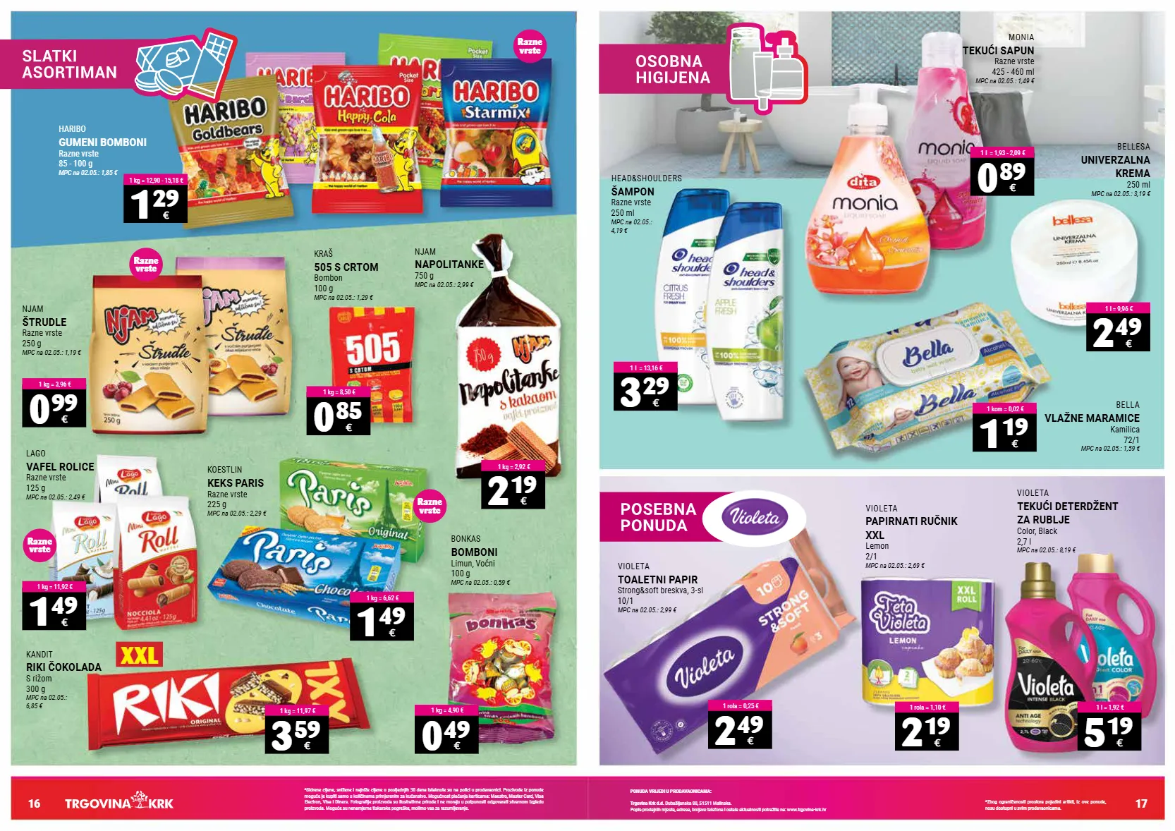 *sidrene cijene, snižene i najniže cijene u posljednjih 30 dana istaknute su na polici u prodavaonici. prozivode iz ponude moguće je kupiti samo u količinama primjerenim za kućanstvo. mogućnost plaćanja karticama: maestro, master card, visa electron, visa i diners. fotografije proizvoda su ilustrativne prirode i ne moraju u potpunosti odgovarati stvarnom izgledu proizvoda. moguće su nenamjerne tiskarske pogreške, molimo vas za razumijevanje. ponuda vrijedi u prodavaonicama: trgovina krk d.d. dubašljanska 80, 51511 malinska. popis prodajnih mjesta, adresa, brojeve telefona i ostale aktualnosti potražite na: www.trgovina-krk.hr *zbog ograničenosti prostora pojedini artikli, iz ove ponude, nosu dostupni u svim prodavaonicama. 17 16 kraš 505 s crtom bombon 100 g mpc na 02.05.: 1,29 € haribo gumeni bomboni razne vrste 85 - 100 g mpc na 02.05.: 1,85 € njam štrudle razne vrste 250 g mpc na 02.05.: 1,19 € bonkas bomboni limun, voćni 100 g mpc na 02.05.: 0,59 € koestlin keks paris razne vrste 225 g mpc na 02.05.: 2,29 € njam napolitanke 750 g mpc na 02.05.: 2,99 € lago vafel rolice razne vrste 125 g mpc na 02.05.: 2,49 € 0 85 € 1 kg = 8,50 € 1 29 € 1 kg = 12,90 - 15,18 € 0 99 € 1 kg = 3,96 € 0 49 € 1 kg = 4,90 € 1 49 € 1 kg = 6,62 € 2 19 € 1 kg = 2,92 € 1 49 € 1 kg = 11,92 € bellesa univerzalna krema 250 ml mpc na 02.05.: 3,19 € bella vlažne maramice kamilica 72/1 mpc na 02.05.: 1,59 € violeta toaletni papir strong&soft breskva, 3-sl 10/1 mpc na 02.05.: 2,99 € violeta papirnati ručnik xxl lemon 2/1 mpc na 02.05.: 2,69 € violeta tekući deterdžent za rublje color, black 2,7 l mpc na 02.05.: 8,19 € head&shoulders šampon razne vrste 250 ml mpc na 02.05.: 4,19 € monia tekući sapun razne vrste 425 - 460 ml mpc na 02.05.: 1,49 € 2 49 € 1 l = 9,96 € 1 19 € 1 kom = 0,02 € 2 49 € 1 rola = 0,25 € 2 19 € 1 rola = 1,10 € 5 19 € 1 l = 1,92 € 3 29 € 1 l = 13,16 € 0 89 € 1 l = 1,93 - 2,09 € razne vrste razne vrste razne vrste razne vrste kandit riki čokolada s rižom 300 g mpc na 02.05.: 6,85 € 3 59 € 1 kg = 11,97 € xxl