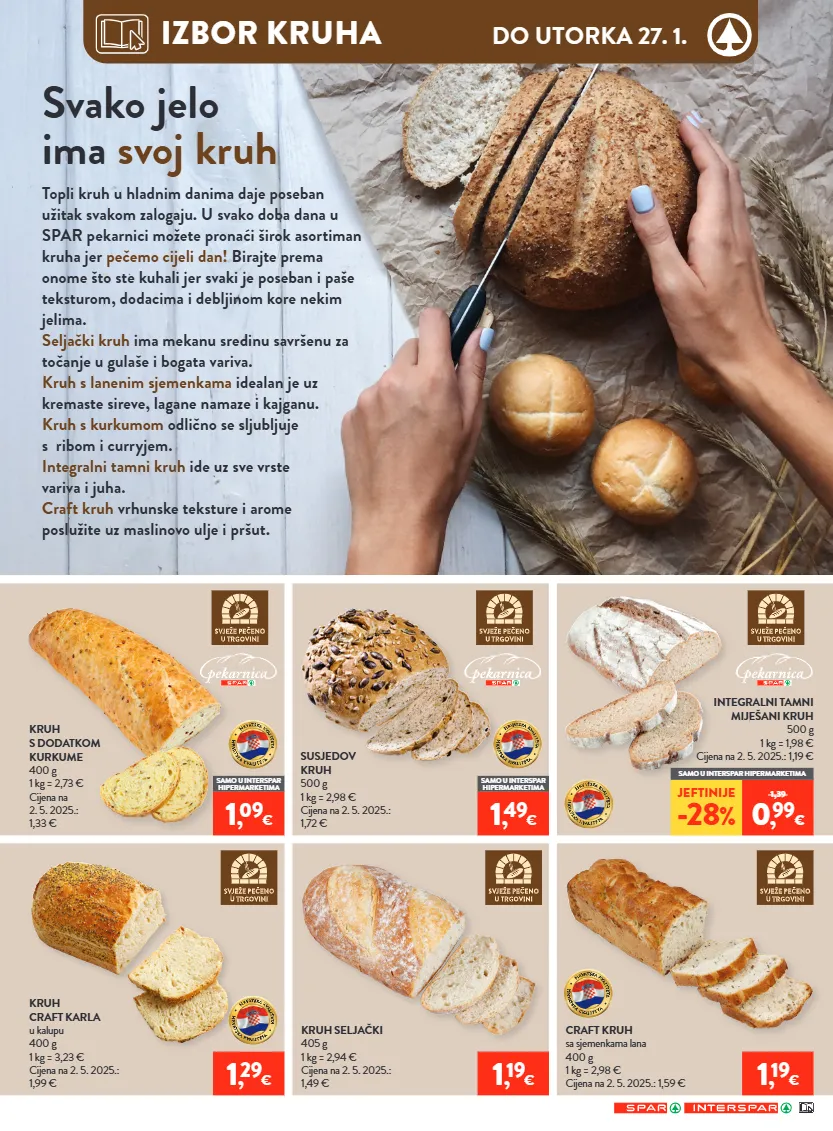 9 primorski kruh mlinar , 500 g 1 kg = 2,58 € cijena na 2. 5. 2025.: 1,95 € kruh hrskavo zlato 420 g 1 kg = 2,83 € cijena na 2. 5. 2025.: 1,66 € bruschette maretti razne vrste 70 g 1 kg = 11,29 € cijena na 2. 5. 2025.: 0,95 € jeftinije -28 % 2,09 1 , 49 € slavonska pogača 850 g 1 kg = 1,75 € cijena na 2. 5. 2025.: 1,49 € jeftinije -44 % 0,89 0 , 49 € croissant praline 75 g 1 kg = 6,53 € cijena na 2. 5. 2025.: 0,89 € polubijeli kruh 700 g 1 kg = 1,49 € cijena na 2. 5. 2025.: 1,04 € 1 , 04 € donut enjoy odabrane vrste od 56 g do 71 g 1 kg od 6,90 € do 8,75 € cijena na 2. 5. 2025.: od 0,62 € do 0,79 € 0 , 49 € 1 , 19 € 0 , 79 € 1 , 29 € pureći bečki odrezak 1 kg 12 , 99 € krumpir kriške 1 kg 3 , 99 € 3 , 79 € lasagne s mesom ili s povrćem 1 kom 1 , 59 € brzo i ukusno hladno prešani sok razni okusi 0,33 l 1 l = 11,48 € cijena na 2. 5. 2025.: 3,79 € 2+1 gratis samo uz -35% -35% toast klara classic ili integralni 500 g krafna s nadjevom od marelice 240 g ili 480 g 1 kg od 7,27 € do 7,46 € cijena na 2. 5. 2025.: od 2,09 € do 3,89 € već od: 1 , 79 € • 4 komada u pakiranju • 8 komada u pakiranju iskoristi svoj kupon... u cijenu uključena povratna naknada cijena za 1 komad samo u interspar hipermarketima samo u interspar hipermarketima svježe iz pekare do utorka 27. 1.