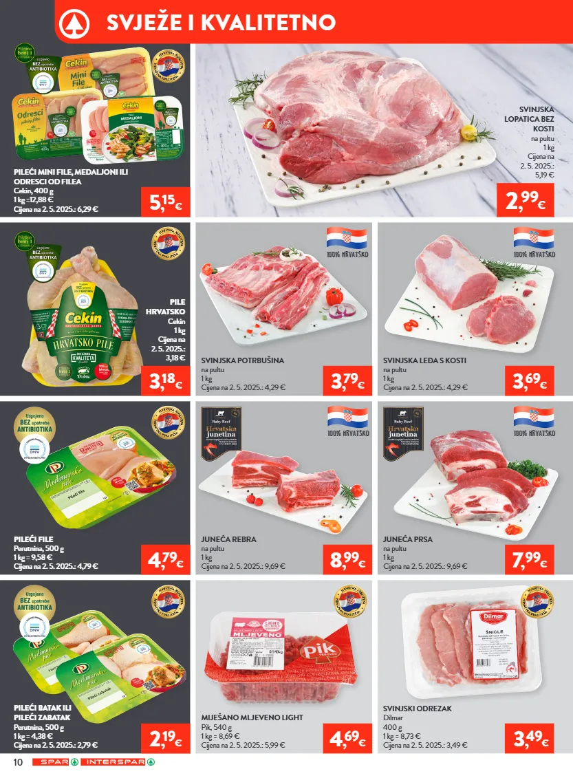10 svježe i kvalitetno pile hrvatsko cekin 1 kg cijena na 2. 5. 2025.: 3,18 € 3 , 18 € pileći file perutnina, 500 g 1 kg = 9,58 € cijena na 2. 5. 2025.: 4,79 € 4 , 79 € pileći batak ili pileći zabatak perutnina, 500 g 1 kg = 4,38 € cijena na 2. 5. 2025.: 2,79 € 2 , 19 € svinjska potrbušina na pultu 1 kg cijena na 2. 5. 2025.: 4,29 € 3 , 79 € svinjski odrezak dilmar 400 g 1 kg = 8,73 € cijena na 2. 5. 2025.: 3,49 € 3 , 49 € svinjska leđa s kosti na pultu 1 kg cijena na 2. 5. 2025.: 4,29 € 3 , 69 € juneća prsa na pultu 1 kg cijena na 2. 5. 2025.: 9,69 € 7 , 99 € miješano mljeveno light pik, 540 g 1 kg = 8,69 € cijena na 2. 5. 2025.: 5,99 € 4 , 69 € juneća rebra na pultu 1 kg cijena na 2. 5. 2025.: 9,69 € 8 , 99 € svinjska lopatica bez kosti na pultu 1 kg cijena na 2. 5. 2025.: 5,19 € 2 , 99 € pileći mini file, medaljoni ili odresci od filea cekin, 400 g 1 kg =12,88 € cijena na 2. 5. 2025.: 6,29 € 5 , 15 € 100% hrvatsko 100% hrvatsko 100% hrvatsko 100% hrvatsko