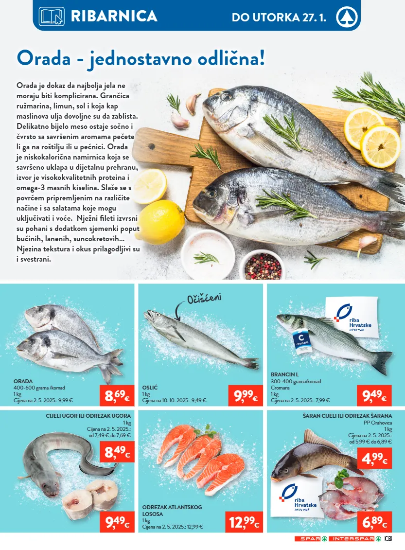 orada - jednostavno odlična! orada je dokaz da najbolja jela ne moraju biti komplicirana. grančica ružmarina, limun, sol i koja kap maslinova ulja dovoljne su da zablista. delikatno bijelo meso ostaje sočno i čvrsto sa savršenim aromama pečete li ga na roštilju ili u pećnici. orada je niskokalorična namirnica koja se savršeno uklapa u dijetalnu prehranu, izvor je visokokvalitetnih proteina i omega-3 masnih kiselina. slaže se s povrćem pripremljenim na različite načine i sa salatama koje mogu uključivati i voće. nježni fileti izvrsni su pohani s dodatkom sjemenki poput bučinih, lanenih, suncokretovih… njezina tekstura i okus prilagodljivi su i svestrani. do utorka 27. 1. ribarnica 8 , 69 € 9 , 49 € 9 , 99 € 12 , 99 € orada 400-600 grama /komad 1 kg cijena na 2. 5. 2025.: 9,99 € brancin l 300-400 grama/komad cromaris 1 kg cijena na 2. 5. 2025.: 7,99 € oslić 1 kg cijena na 10. 10. 2025.: 9,49 € odrezak atlantskog lososa 1 kg cijena na 2. 5. 2025.: 12,99 € očišćeni šaran cijeli ili odrezak šarana pp orahovica 1 kg cijena na 2. 5. 2025.: od 5,99 € do 6,89 € cijeli ugor ili odrezak ugora 1 kg cijena na 2. 5. 2025.: od 7,49 € do 7,69 € 4 , 99 € 8 , 49 € 6 , 89 € 9 , 49 €