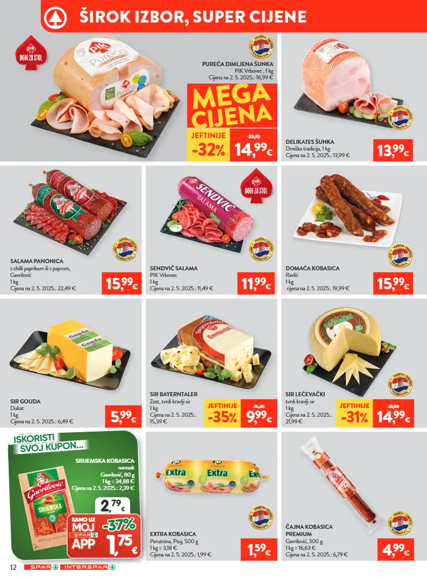 iskoristi svoj kupon... 12 širok izbor, super cijene pureća dimljena šunka pik vrbovec , 1 kg cijena na 2. 5. 2025.: 18,99 € sir gouda dukat 1 kg cijena na 2. 5. 2025.: 6,49 € 5 , 99 € 4 , 99 € 13 , 99 € 15 , 99 € 15 , 99 € 11 , 99 € 1 , 59 € srijemska kobasica narezak gavrilović, 80 g 1 kg = 34,88 € cijena na 2. 5. 2025.: 2,39 € mega cijena jeftinije -32 % 22,19 14 , 99 € domaća kobasica ravlić 1 kg cijena na 2. 5. 2025.: 19,99 € sir lećevački tvrdi kravlji sir 1 kg cijena na 2. 5. 2025.: 21,99 € jeftinije -31 % 21,99 14 , 99 € sendvič salama pik vrbovec 1 kg cijena na 2. 5. 2025.: 11,49 € sir bayerntaler zott, tvrdi kravlji sir 1 kg cijena na 2. 5. 2025.: 15,39 € jeftinije -35 % 15,39 9 , 99 € čajna kobasica premium gavrilović, 300 g 1 kg = 16,63 € cijena na 2. 5. 2025.: 6,79 € extra kobasica perutnina, ptuj, 500 g 1 kg = 3,18 € cijena na 2. 5. 2025.: 1,99 € salama panonica s chilli paprikom ili s paprom, gavrilović 1 kg cijena na 2. 5. 2025.: 22,49 € delikates šunka drniška tradicija, 1 kg cijena na 2. 5. 2025.: 13,99 € 2 , 79 € samo uz 1 , 75 € -37% -37%