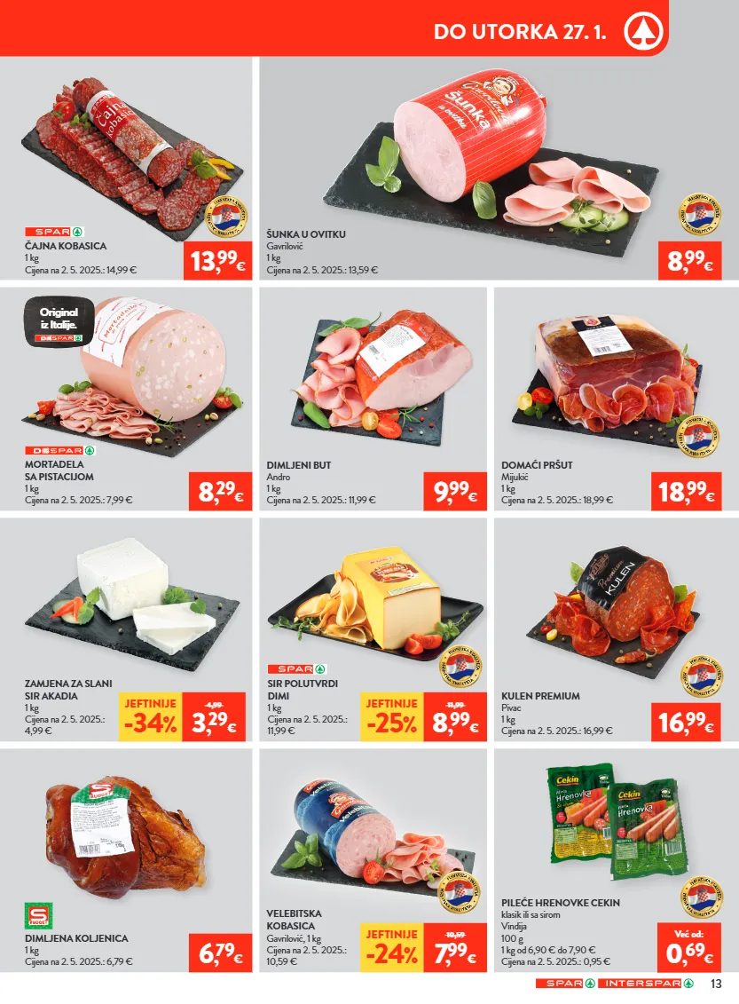 13 jeftinije -24 % 10,59 7 , 99 € do utorka 27. 1. dimljeni but andro 1 kg cijena na 2. 5. 2025.: 11,99 € 9 , 99 € 18 , 99 € 16 , 99 € 8 , 29 € čajna kobasica 1 kg cijena na 2. 5. 2025.: 14,99 € 13 , 99 € 8 , 99 € zamjena za slani sir akadia 1 kg cijena na 2. 5. 2025.: 4,99 € dimljena koljenica 1 kg cijena na 2. 5. 2025.: 6,79 € 6 , 79 € domaći pršut mijukić 1 kg cijena na 2. 5. 2025.: 18,99 € kulen premium pivac 1 kg cijena na 2. 5. 2025.: 16,99 € jeftinije -34 % 4,99 3 , 29 € sir polutvrdi dimi 1 kg cijena na 2. 5. 2025.: 11,99 € jeftinije -25 % 11,99 8 , 99 € mortadela sa pistacijom 1 kg cijena na 2. 5. 2025.: 7,99 € pileće hrenovke cekin klasik ili sa sirom vindija 100 g 1 kg od 6,90 € do 7,90 € cijena na 2. 5. 2025.: 0,95 € velebitska kobasica gavrilović, 1 kg cijena na 2. 5. 2025.: 10,59 € šunka u ovitku gavrilović 1 kg cijena na 2. 5. 2025.: 13,59 € original iz italije. već od: 0 , 69 €