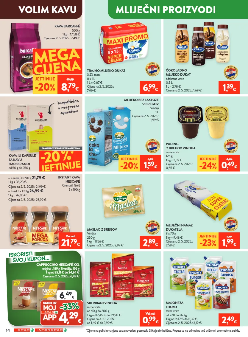 14 iskoristi svoj kupon... samo u interspar hipermarketima mliječni proizvodi instant kava nescafé crema ili gold 3 x 190 g kava barcaffé 500 g 1 kg = 17,58 € cijena na 2. 5. 2025.: 7,49 € trajno mlijeko dukat 3,2% m.m. 8 x 1 l 1 l = 0,87 € cijena na 2. 5. 2025.: 7,99 € čokoladno mlijeko dukat odabrane vrste 0,5 l 1 l = 2,78 € cijena na 2. 5. 2025.: 1,69 € mliječni namaz dukatela 3 x 70 g 1 kg = 9,48 € cijena na 2. 5. 2025.: 2,59 € puding ‘z bregov vindija razne vrste 125 g 1 kg = 3,92 € cijena na 2. 5. 2025.: 0,65 € mlijeko bez laktoze ‘z bregov vindija 1 l cijena na 2. 5. 2025.: 1,99 € majoneza thomy razne vrste od 220 do 263 g 1 kg od 9,47 € do 11,32 € cijena na 2. 5. 2025.: 3,19 € kava ili kapsule za kavu hausbrandt od 50 g do 250 g maslac ‘z bregov vindija 250 g 1 kg = 11,56 € cijena na 2. 5. 2025.: 2,99 € sir ribani vindija razne vrste od 40 g do 200 g 1 kg od 17,45 € do 29,90 € cijena na 3. 10. 2025.: od 1,49 € do 3,99 € jeftinije -24 % 0,65 0 , 49 € jeftinije -20 % 1,99 1 , 59 € jeftinije -23 % 2,59 1 , 99 € cappuccino nescafé xxl original , 189 g ili vanilija, 196 g 1 kg od 33,11 € do 34,34 € cijena na 2. 5. 2025.: 6,49 € -20 % * jeftinije 6 , 49 € samo uz 4 , 29 € -33% -33% mega cijena jeftinije -20 % 10,99 8 , 79 € već od: 0 , 99 € već od: 21 , 79 € volim kavu 2 , 89 € 1 , 39 € 6 , 99 € 2 , 49 € *cijene na polici umanjene su za navedeni postotak. slika je simbolična. popust se ne odnosi na već snižene i promotivne artikle. • crema 3 x 190 g 21,79 € 1 kg = 38,23 € cijena na 2. 5. 2025.: 21,99 € • gold 3 x 190 g 26,99 € 1 kg = 47,35 € cijena na 2. 5. 2025.: 25,99 € kompatibilne s nespresso aparatima