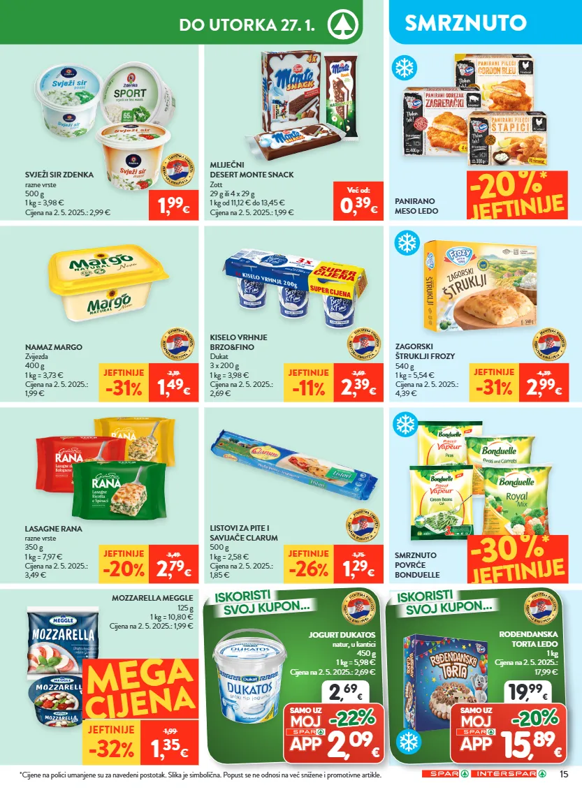 do utorka 27. 1. 15 iskoristi svoj kupon... iskoristi svoj kupon... svježi sir zdenka razne vrste 500 g 1 kg = 3,98 € cijena na 2. 5. 2025.: 2,99 € mliječni desert monte snack zott 29 g ili 4 x 29 g 1 kg od 11,12 € do 13,45 € cijena na 2. 5. 2025.: 1,99 € zagorski štruklji frozy 540 g 1 kg = 5,54 € cijena na 2. 5. 2025.: 4,39 € panirano meso ledo smrznuto povrće bonduelle lasagne rana razne vrste 350 g 1 kg = 7,97 € cijena na 2. 5. 2025.: 3,49 € namaz margo zvijezda 400 g 1 kg = 3,73 € cijena na 2. 5. 2025.: 1,99 € kiselo vrhnje brzo&fino dukat 3 x 200 g 1 kg = 3,98 € cijena na 2. 5. 2025.: 2,69 € listovi za pite i savijače clarum 500 g 1 kg = 2,58 € cijena na 2. 5. 2025.: 1,85 € jeftinije -26 % 1,75 1 , 29 € jeftinije -20 % 3,49 2 , 79 € jeftinije -31 % 4,39 2 , 99 € jeftinije -31 % 2,19 1 , 49 € jeftinije -11 % 2,69 2 , 39 € jogurt dukatos natur, u kantici 450 g 1 kg = 5,98 € cijena na 2. 5. 2025.: 2,69 € rođendanska torta ledo 1 kg cijena na 2. 5. 2025.: 17,99 € -20 % * jeftinije -30 % * jeftinije 2 , 69 € samo uz 2 , 09 € -22% -22% 19 , 99 € samo uz 15 , 89 € -20% -20% već od: 0 , 39 € 1 , 99 € mozzarella meggle 125 g 1 kg = 10,80 € cijena na 2. 5. 2025.: 1,99 € mega cijena jeftinije -32 % 1,99 1 , 35 € *cijene na polici umanjene su za navedeni postotak. slika je simbolična. popust se ne odnosi na već snižene i promotivne artikle. smrznuto
