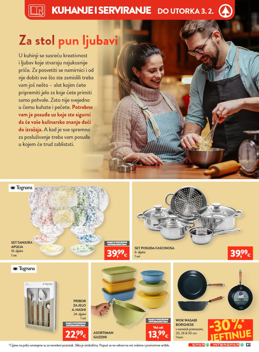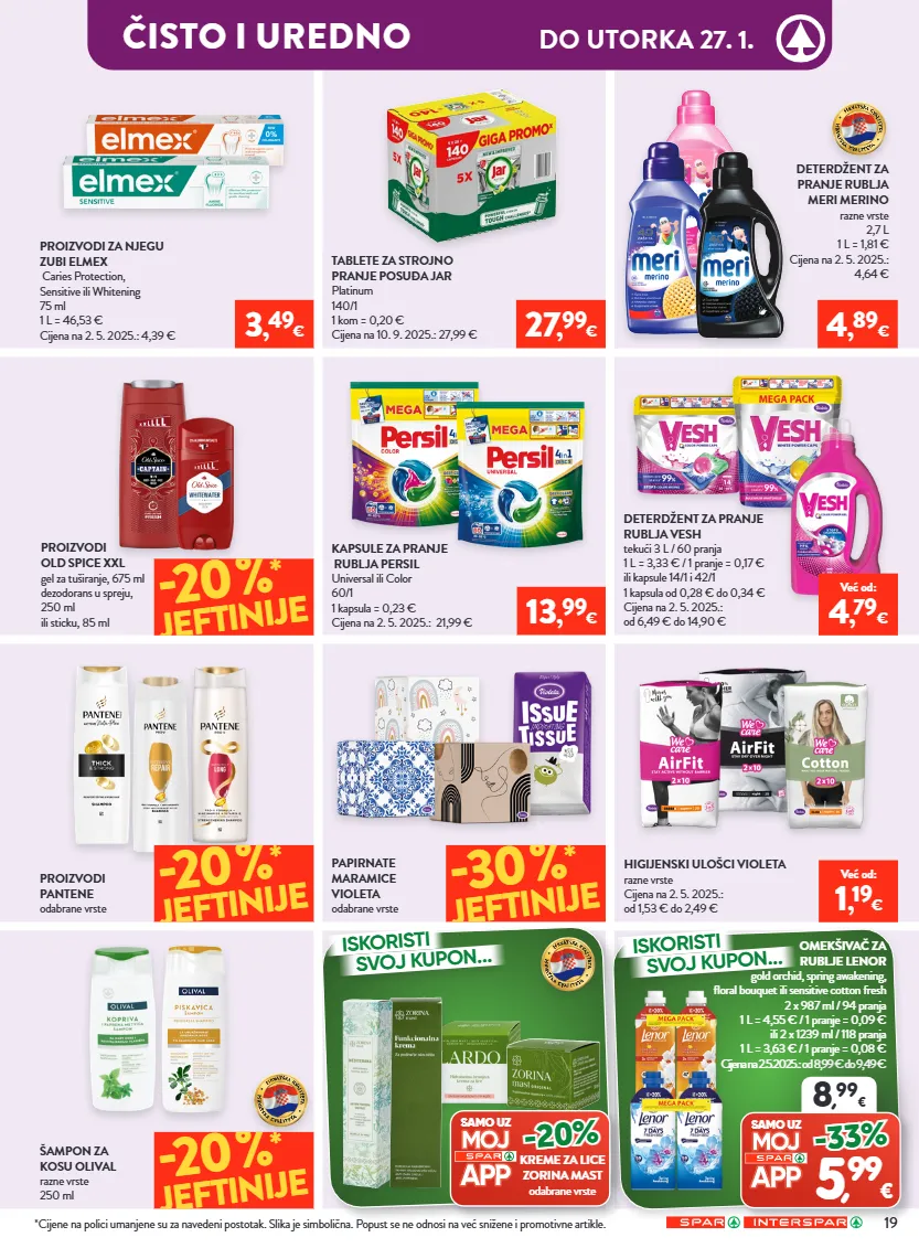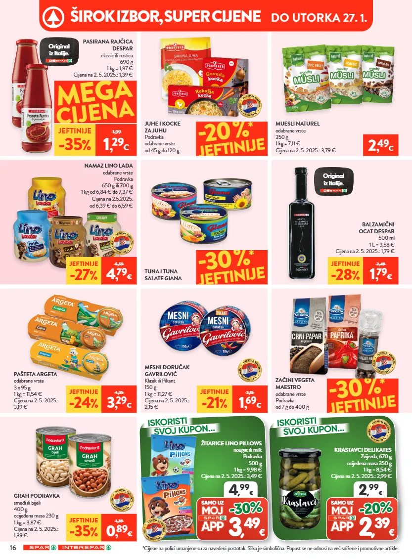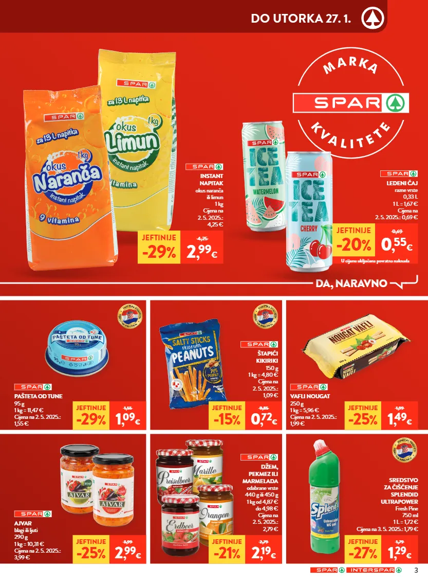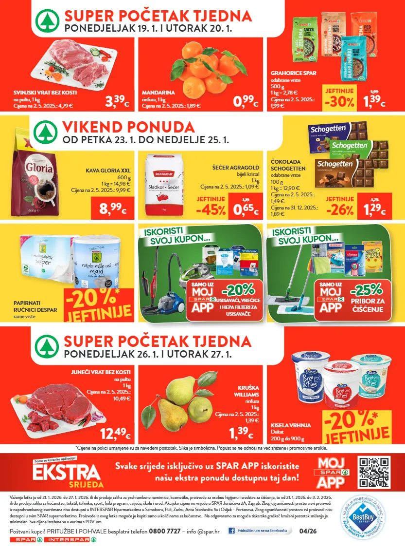 važenje letka je od 21. 1. 2026. do 27. 1. 2026. ili do prodaje zaliha za prehrambene namirnice, kozmetiku, proizvode za osobnu higijenu i sredstva za čišćenje, te od 21. 1. 2026. do 3. 2. 2026. ili do prodaje zaliha za kućanstvo, tekstil, tehniku, sport, hobi program, cvijeće, školu i ured. akcijske cijene ne vrijede u spar jurišićeva 2a, zagreb. zbog ograničenosti prostora svi proizvodi iz neprehrambenog asortimana nisu dostupni u interspar hipermarketima u samoboru, puli, zadru, ante starčevića 5a i osijek - portanova. zbog ograničenosti prostora svi proizvodi nisu dostupni u svim spar supermarketima. proizvode iz ovog letka moguće je kupiti samo u količinama za kućanstvo. ne odgovaramo za moguće tiskarske greške! izraženi postotak sniženja je minimalan. sve cijene izražene su u eurima s pdv-om. poštvani kupci! pritužbe i pohvale besplatni telefon 0800 7727 – info @spar.hr super početak tjedna ponedjeljak 19. 1. i utorak 20. 1. 04/26 šećer agragold bijeli kristal 1 kg cijena na 2. 5. 2025.: 1,09 € 8 , 99 € 1 , 39 € super početak tjedna ponedjeljak 26. 1. i utorak 27. 1. jeftinije -45 % 1,19 0 , 65 € grahorice spar odabrane vrste 500 g 1 kg = 2,78 € cijena na 2. 5. 2025.: 1,99 € jeftinije -30 % 1,99 1 , 39 € svinjski vrat bez kosti na pultu, 1 kg cijena na 2. 5. 2025.: 4,79 € mandarina rinfuza, 1 kg cijena na 2. 5. 2025.: 1,89 € 0 , 99 € 3 , 39 € *cijene na polici umanjene su za navedeni postotak. slika je simbolična. popust se ne odnosi na već snižene i promotivne artikle. čokolada schogetten odabrane vrste 100 g 1 kg = 12,90 € cijena na 2. 5. 2025.: 1,49 € cijena na 31. 12. 2025.: 1,89 € jeftinije -26 % 1,75 1 , 29 € iskoristi svoj kupon... iskoristi svoj kupon... vikend ponuda od petka 23. 1. do nedjelje 25. 1. juneći vrat bez kosti na pultu 1 kg cijena na 2. 5. 2025.: 10,49 € 12 , 49 € kava gloria xxl 600 g 1 kg = 14,98 € cijena na 2. 5. 2025.: 9,99 € papirnati ručnici despar razne vrste kisela vrhnja dukat 200 g do 900 g kruška williams rinfuza 1 kg cijena na 2. 5. 2025.: 1,39 € -20 % * jeftinije samo uz -25% -25% pribor za čišćenje samo uz -20% -20% usisavači, vrećice i hepa filteri za usisavače -20 % * jeftinije
