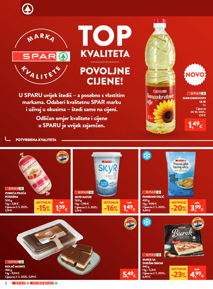 top kvaliteta povoljne cijene! 2 1 , 49 € 5 , 49 € jeftinije -20 % 4,99 3 , 99 € jeftinije -15 % 1,89 1 , 59 € jeftinije -23 % 6,49 4 , 99 € jeftinije -16 % 1,79 1 , 49 € u sparu uvijek štediš – a posebno s vlastitim markama. odaberi kvalitetnu spar marku i uživaj u okusima – štedi samo na cijeni. odličan omjer kvalitete i cijene u sparu je uvijek zajamčen. suncokretovo ulje 1 l cijena na 24. 10. 2025.: 1,59 € panirani oslić 400 g 1 kg = 9,98 € cijena na 2. 5. 2025.: 4,49 € pureća pileća posebna 500 g 1 kg = 3,18 € cijena na 2. 5. 2025.: 1,59 € potvrđena kvaliteta kolač monte 460 g 1 kg = 11,93 € cijena na 2. 5. 2025.: 5,99 € burek sa svježim sirom 940 g 1 kg = 5,31 € cijena na 2. 5. 2025.: 6,49 € skyr natur 500 g 1 kg = 2,98 € cijena na 2. 5. 2025.: 1,79 € novo