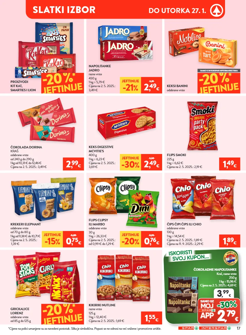 slatki izbor do utorka 27. 1. iskoristi svoj kupon... 17 proizvodi kit kat, smarties i lion keksi banini odabrane vrste napolitanke jadro razne vrste 430 g 1 kg = 5,79 € cijena na 2. 5. 2025.: 3,49 € flips clipsy ili marbo odabrane vrste 30 g 1 kg = 26,33 € cijena na 2. 5. 2025.: od 0,99 € do 1,29 € grickalice lorenz odabrane vrste od 85 g do 125 g čips čipi čips ili chio odabrane vrste 130 g 1 kg = 14,54 € cijena na 2. 5. 2025.: 1,89 € cijena na 11. 9. 2025.: 2,29 € krekeri elephant odabrane vrste od 70 g do 80 g 1 kg od 9,38 € do 10,71 € cijena na 2. 5. 2025.: 1,39 € kikiriki nutline razne vrste 125 g 1 kg = 12,40 € cijena na 2. 5. 2025.: 1,69 € čokolada dorina kraš odabrane vrste od 240 g do 290 g 1 kg od 10,31 € do 12,46 € cijena na 2. 5. 2025.: 3,49 € keks digestive mcvitie’s 400 g 1 kg = 6,23 € cijena na 2. 5. 2025.: 3,69 € flips smoki 225 g 1 kg = 6,62 € cijena na 2. 5. 2025.: 2,19 € jeftinije -20 % 0,95 0 , 76 € čokoladne napolitanke kraš, razne vrste 250 g 1 kg = 15,96 € cijena na 2. 5. 2025.: 4,69 € -20 % * jeftinije -20 % * jeftinije -20 % * jeftinije 3 , 99 € samo uz 2 , 79 € -30% -30% *cijene na polici umanjene su za navedeni postotak. slika je simbolična. popust se ne odnosi na već snižene i promotivne artikle. jeftinije -21 % 3,19 2 , 49 € jeftinije -30 % 3,59 2 , 49 € 1 , 49 € 2 , 99 € 1 , 89 € 1 , 55 € jeftinije -15 % 0,89 0 , 75 € samo u interspar hipermarketima