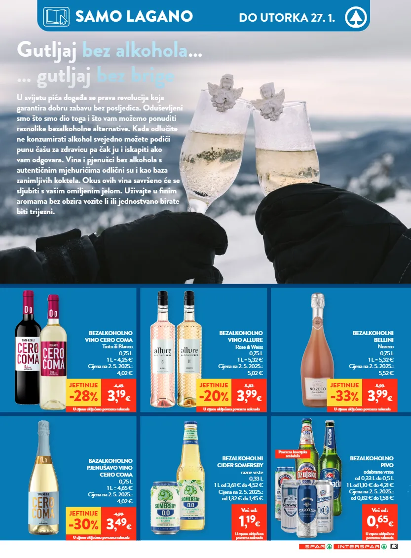 gutljaj bez alkohola… … gutljaj bez brige u svijetu pića događa se prava revolucija koja garantira dobru zabavu bez posljedica. oduševljeni smo što smo dio toga i što vam možemo ponuditi raznolike bezalkoholne alternative. kada odlučite ne konzumirati alkohol svejedno možete podići punu čašu za zdravicu pa čak ju i iskapiti ako vam odgovara. vina i pjenušci bez alkohola s autentičnim mjehurićima odlični su i kao baza zanimljivih koktela. okus ovih vina savršeno će se sljubiti s vašim omiljenim jelom. uživajte u finim aromama bez obzira vozite li ili jednostvano birate biti trijezni. do utorka 27. 1. samo lagano bezalkoholno vino allure rose ili weiss 0,75 l 1 l = 5,32 € cijena na 2. 5. 2025.: 5,02 € bezalkoholni cider somersby razne vrste 0,33 l 1 l od 3,61 € do 4,52 € cijena na 2. 5. 2025.: od 1,32 € do 1,45 € bezalkoholno pivo odabrane vrste od 0,33 l do 0,5 l 1 l od 1,10 € do 4,21 € cijena na 2. 5. 2025.: od 0,82 € do 1,58 € bezalkoholni bellini nozeco 0,75 l 1 l = 5,32 € cijena na 2. 5. 2025.: 5,52 € bezalkoholno vino cero coma tinto ili blanco 0,75 l 1 l = 4,25 € cijena na 2. 5. 2025.: 4,02 € bazalkoholno pjenušavo vino cero coma 0,75 l 1 l = 4,65 € cijena na 2. 5. 2025.: 4,02 € u cijenu uključena povratna naknada jeftinije -28 % 4,49 3 , 19 € u cijenu uključena povratna naknada jeftinije -30 % 4,99 3 , 49 € u cijenu uključena povratna naknada jeftinije -20 % 5,02 3 , 99 € u cijenu uključena povratna naknada jeftinije -33 % 5,99 3 , 99 € u cijenu uključena povratna naknada već od: 1 , 19 € u cijenu uključena povratna naknada već od: 0 , 65 € povratna kaucijska ambalaža