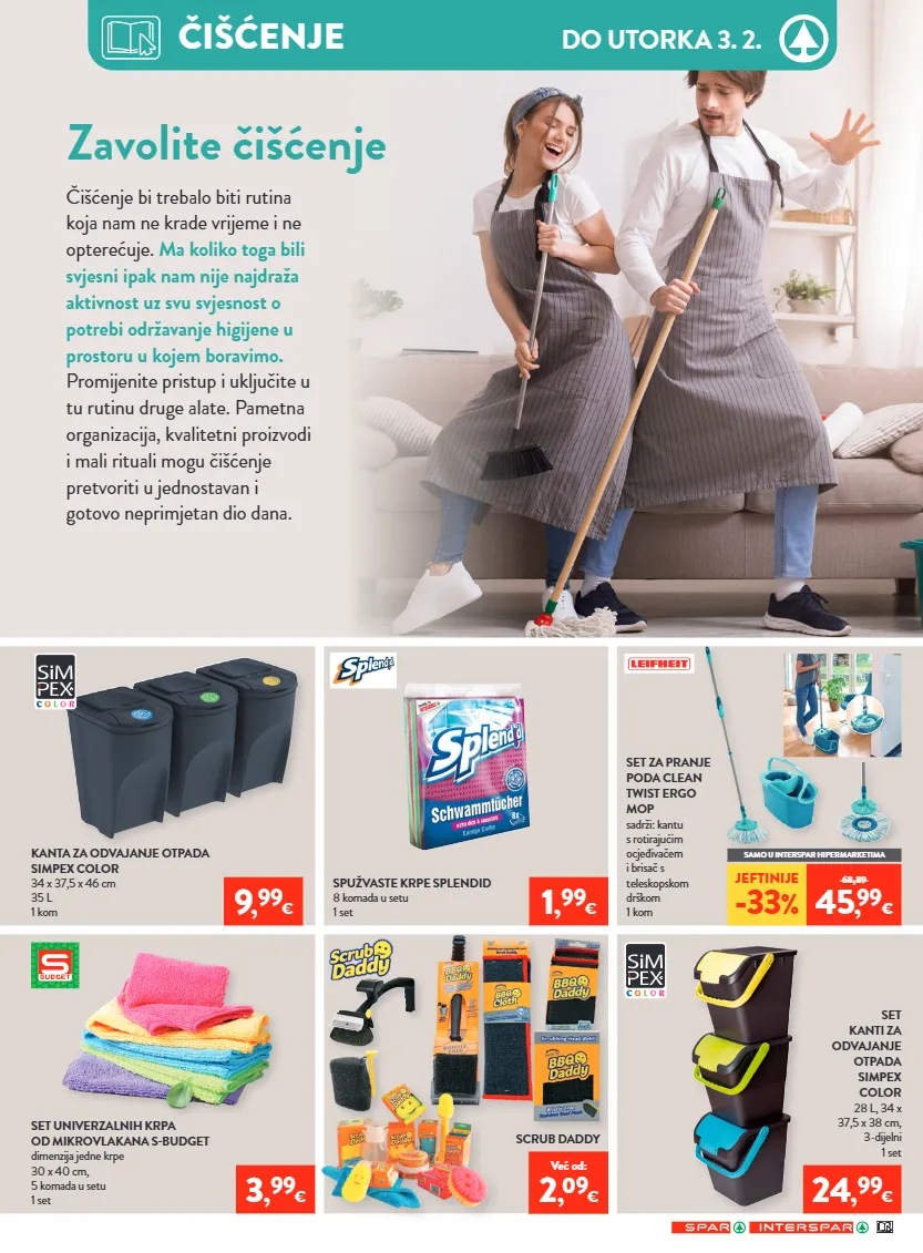 set univerzalnih krpa od mikrovlakana s-budget dimenzija jedne krpe 30 x 40 cm, 5 komada u setu 1 set kanta za odvajanje otpada simpex color 34 x 37,5 x 46 cm 35 l 1 kom set za pranje poda clean twist ergo mop sadrži: kantu s rotirajućim ocjeđivačem i brisač s teleskopskom drškom 1 kom spužvaste krpe splendid 8 komada u setu 1 set scrub daddy set kanti za odvajanje otpada simpex color 28 l, 34 x 37,5 x 38 cm, 3-dijelni 1 set 24 , 99 € 9 , 99 € 1 , 99 € 3 , 99 € čišćenje bi trebalo biti rutina koja nam ne krade vrijeme i ne opterećuje. ma koliko toga bili svjesni ipak nam nije najdraža aktivnost uz svu svjesnost o potrebi održavanje higijene u prostoru u kojem boravimo. promijenite pristup i uključite u tu rutinu druge alate. pametna organizacija, kvalitetni proizvodi i mali rituali mogu čišćenje pretvoriti u jednostavan i gotovo neprimjetan dio dana. zavolite čišćenje samo u interspar hipermarketima jeftinije -33 % 68,89 45 , 99 € već od: 2 , 09 € do utorka 3. 2. čišćenje