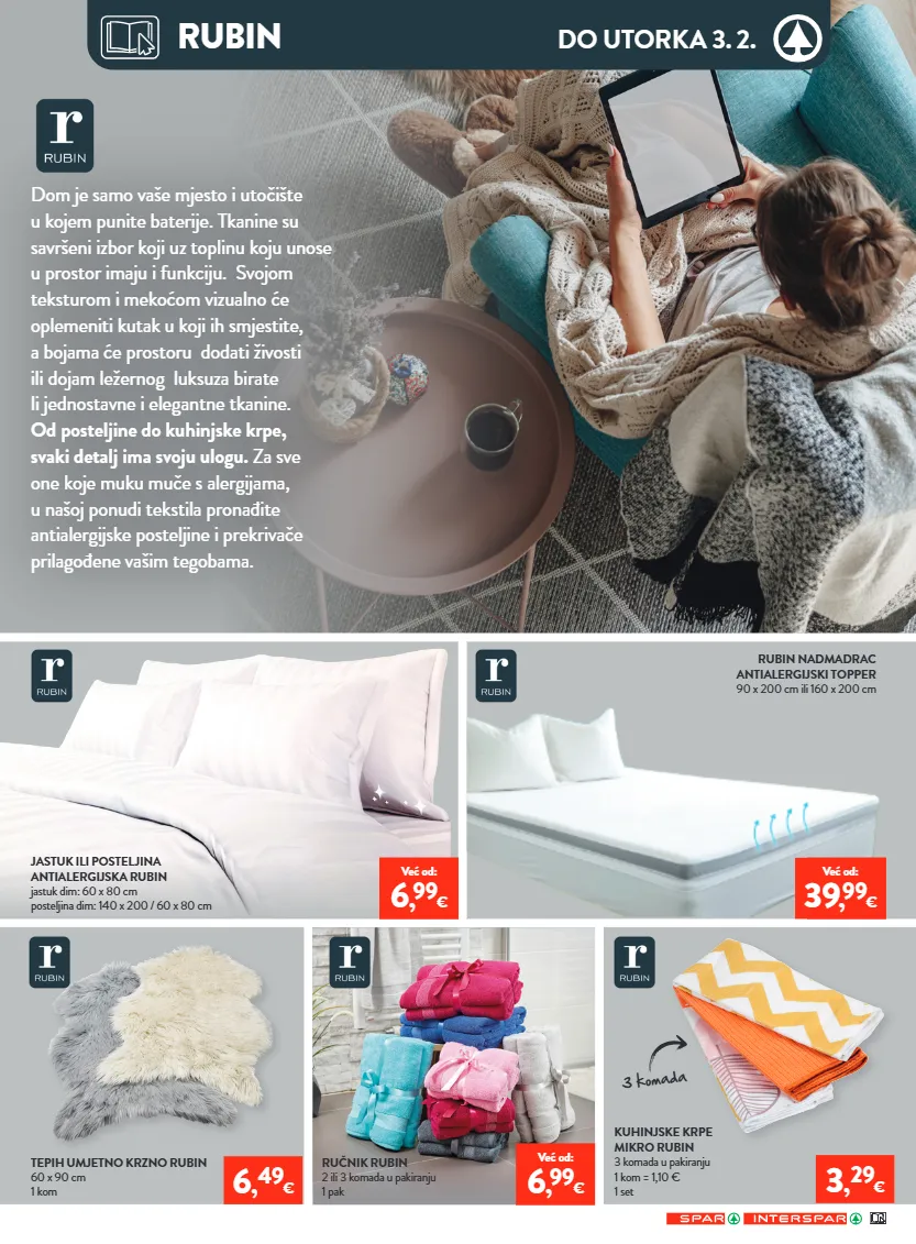 dom je samo vaše mjesto i utočište u kojem punite baterije. tkanine su savršeni izbor koji uz toplinu koju unose u prostor imaju i funkciju. svojom teksturom i mekoćom vizualno će oplemeniti kutak u koji ih smjestite, a bojama će prostoru dodati živosti ili dojam ležernog luksuza birate li jednostavne i elegantne tkanine. od posteljine do kuhinjske krpe, svaki detalj ima svoju ulogu. za sve one koje muku muče s alergijama, u našoj ponudi tekstila pronađite antialergijske posteljine i prekrivače prilagođene vašim tegobama. do utorka 3. 2. rubin jastuk ili posteljina antialergijska rubin jastuk dim: 60 x 80 cm posteljina dim: 140 x 200 / 60 x 80 cm ručnik rubin 2 ili 3 komada u pakiranju 1 pak tepih umjetno krzno rubin 60 x 90 cm 1 kom kuhinjske krpe mikro rubin 3 komada u pakiranju 1 kom = 1,10 € 1 set rubin nadmadrac antialergijski topper 90 x 200 cm ili 160 x 200 cm 6 , 49 € 3 , 29 € već od: 6 , 99 € već od: 39 , 99 € već od: 6 , 99 € 3 komada
