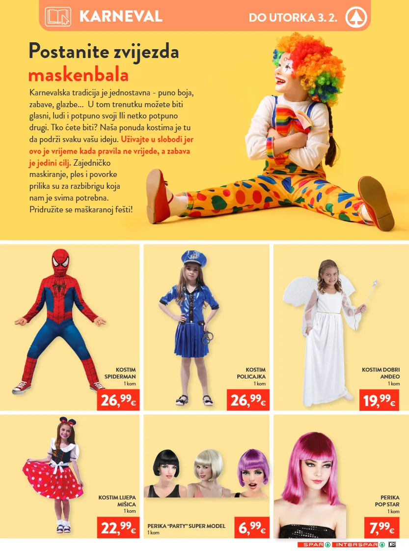 kostim spiderman 1 kom kostim lijepa mišica 1 kom kostim policajka 1 kom kostim dobri anđeo 1 kom perika “party” super model 1 kom perika pop star 1 kom 26 , 99 € 22 , 99 € 26 , 99 € 6 , 99 € 19 , 99 € 7 , 99 € postanite zvijezda maskenbala karnevalska tradicija je jednostavna - puno boja, zabave, glazbe... u tom trenutku možete biti glasni, ludi i potpuno svoji ili netko potpuno drugi. tko ćete biti? naša ponuda kostima je tu da podrži svaku vašu ideju. uživajte u slobodi jer ovo je vrijeme kada pravila ne vrijede, a zabava je jedini cilj. zajedničko maskiranje, ples i povorke prilika su za razbibrigu koja nam je svima potrebna. pridružite se maškaranoj fešti! do utorka 3. 2. karneval