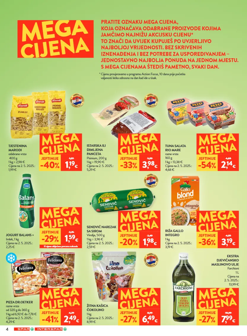 4 pratite oznaku mega cijena, koja označava odabrane proizvode kojima jamčimo najnižu akcijsku cijenu* to znači da uvijek kupuješ po uvjerljivo najboljoj vrijednosti. bez skrivenih iznenađenja i bez potrebe za uspoređivanjem – jednostavno najbolja ponuda na jednom mjestu. s mega cijenama štediš pametno, svaki dan. žitna kašica čokolino 1 kg cijena na 2. 5. 2025.: 8,99 € istarska ili dimljena panceta pisinium, 200 g 1 kg = 19,90 € cijena na 2. 5. 2025.: 5,29 € pizza dr.oetker razne vrste od 320 g do 360 g 1 kg od 6,92 € do 7,78 € cijena na 2. 5. 2025.: 4,29 € jogurt balans + imlek, 1 kg cijena na 2. 5. 2025.: 2,25 € ekstra djevičansko maslinovo ulje farchioni 1 l cijena na 2. 5. 2025.: 13,99 € riža gallo integro 1 kg cijena na 2. 5. 2025.: 3,19 € tuna salata rio mare razne vrste 160 g 1 kg = 13,38 € cijena na 2. 5. 2025.: 4,68 € jeftinije -27 % 8,99 6 , 49 € mega cijena jeftinije -41 % 4,29 2 , 49 € mega cijena sendvič narezak sa sirom vindija, 500 g 1 kg = 3,96 € cijena na 2. 5. 2025.: 2,59 € jeftinije -20 % 2,49 1 , 98 € mega cijena jeftinije -27 % 10,99 7 , 99 € mega cijena jeftinije -36 % 4,99 3 , 19 € mega cijena tjestenina marodi odabrane vrste 400 g 1 kg = 2,98 € cijena na 2. 5. 2025.: 1,99 € jeftinije -40 % 1,99 1 , 19 € mega cijena jeftinije -54 % 4,68 2 , 14 € mega cijena jeftinije -33 % 5,99 3 , 98 € mega cijena mega cijena jeftinije -29 % 2,25 1 , 59 € mega cijena u cijenu uključena povratna naknada * cijenu provjeravamo u programu action focus, 10 dana prije početka valjanosti letka odnosno na dan kad ide u tisak.