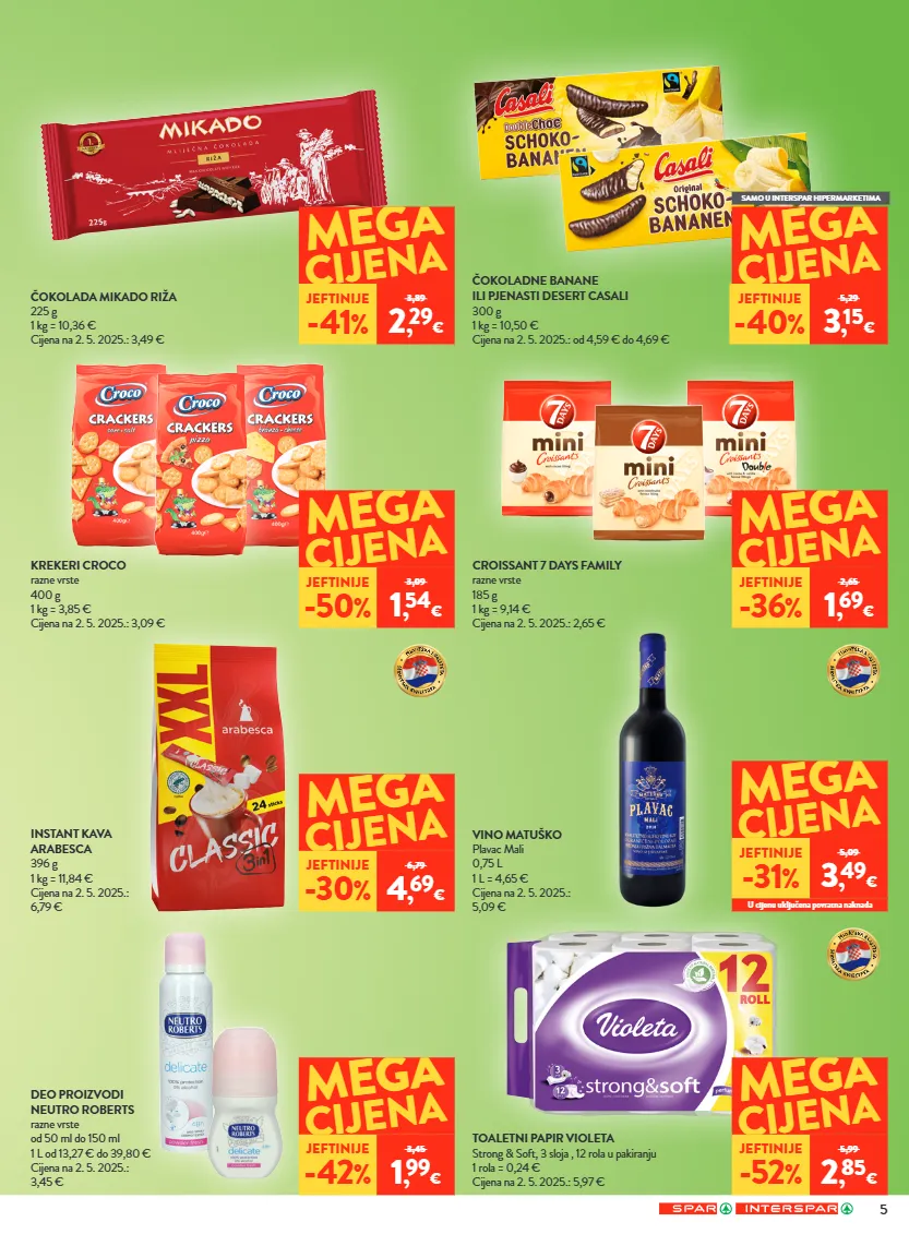 5 deo proizvodi neutro roberts razne vrste od 50 ml do 150 ml 1 l od 13,27 € do 39,80 € cijena na 2. 5. 2025.: 3,45 € instant kava arabesca 396 g 1 kg = 11,84 € cijena na 2. 5. 2025.: 6,79 € krekeri croco razne vrste 400 g 1 kg = 3,85 € cijena na 2. 5. 2025.: 3,09 € čokolada mikado riža 225 g 1 kg = 10,36 € cijena na 2. 5. 2025.: 3,49 € toaletni papir violeta strong & soft, 3 sloja , 12 rola u pakiranju 1 rola = 0,24 € cijena na 2. 5. 2025.: 5,97 € vino matuško plavac mali 0,75 l 1 l = 4,65 € cijena na 2. 5. 2025.: 5,09 € croissant 7 days family razne vrste 185 g 1 kg = 9,14 € cijena na 2. 5. 2025.: 2,65 € čokoladne banane ili pjenasti desert casali 300 g 1 kg = 10,50 € cijena na 2. 5. 2025.: od 4,59 € do 4,69 € jeftinije -42 % 3,45 1 , 99 € mega cijena jeftinije -30 % 6,79 4 , 69 € mega cijena jeftinije -50 % 3,09 1 , 54 € mega cijena jeftinije -41 % 3,89 2 , 29 € mega cijena jeftinije -52 % 5,99 2 , 85 € mega cijena jeftinije -36 % 2,65 1 , 69 € mega cijena jeftinije -31 % 5,09 3 , 49 € mega cijena u cijenu uključena povratna naknada jeftinije -40 % 5,29 3 , 15 € mega cijena samo u interspar hipermarketima