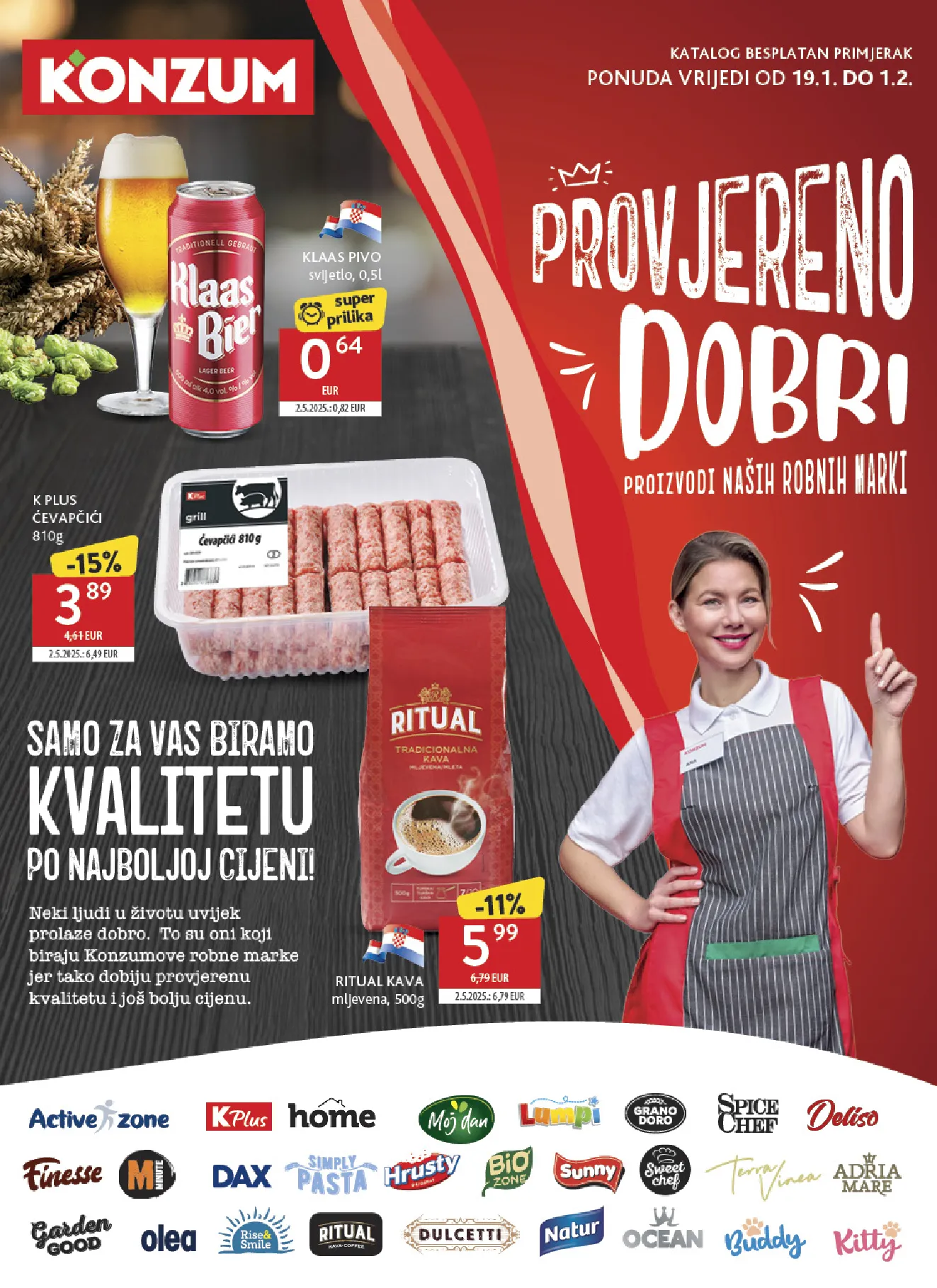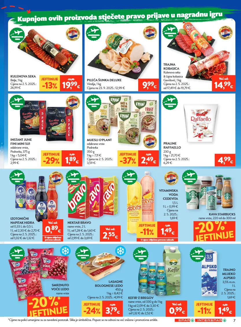*cijene na polici umanjene su za navedeni postotak. slika je simbolična. popust se ne odnosi na već snižene i promotivne artikle. kupnjom ovih proizvoda stječete pravo prijave u nagradnu igru 7 -20 % * jeftinije trajna kobasica kulenova seka ili čajna kobasica gavrilović, 1 kg cijena na 2. 5. 2025.: od 17,49 € do 19,79 € praline raffaello 230 g 1 kg = 21,70 € cijena na 2. 5. 2025.: 6,29 € vitaminska voda cedevita 1,5 l 1 l = 0,99 € cijena na 2. 5. 2025.: 1,69 € kava starbucks razne vrste, 220 ml do 300 ml kulenova seka belje, 1 kg cijena na 2. 5. 2025.: 26,99 € instant juhe fini mini 5u1 odabrane vrste, podravka, 375 g 1 kg = 5,04 € cijena na 2. 5. 2025.: 2,99 € izotonični napitak hidra od 0,33 l do 0,5 l 1 l od 2,30 € do 2,70 € cijena na 2. 5. 2025.: od 1,02 € do 1,32 € smrznuto voće ledo razne vrste jeftinije -13 % 22,99 19 , 99 € jeftinije -29 % 2,69 1 , 89 € jeftinije -37 % 3,99 2 , 49 € jeftinije -11 % 1,69 1 , 49 € pileća šunka deluxe vindija, 1 kg cijena na 23. 9. 2025.: 12,99 € muesli o’plant odabrane vrste podravka 350 g 1 kg = 7,11 € cijena na 2. 5. 2025.: 3,59 € nektar bravo razne vrste, 2 l 1 l od 1,28 € do 1,60 € cijena na 2. 5. 2025.: od 2,99 € do 3,69 € jeftinije -24 % 4,99 3 , 79 € lasagne bolognese ledo 450 g 1 kg = 8,42 € cijena na 2. 5. 2025.: 4,99 € trajno mlijeko alpsko 3,5% m.m. 1 l cijena na 2. 5. 2025.: 1,69 € 9 , 99 € 4 , 99 € jeftinije -11 % 1,69 1 , 49 € u cijenu uključena povratna naknada već od: 2 , 55 € kefir ‘z bregov razne vrste, od 330 g do 1 kg 1 kg od 2,09 € do 3,30 € cijena na 2. 5. 2025.: od 1,32 € do 2,52 € već od: 0 , 99 € već od: 14 , 99 € nagradna igra nagradna igra nagradna igra nagradna igra nagradna igra nagradna igra nagradna igra nagradna igra nagradna igra nagradna igra nagradna igra nagradna igra nagradna igra nagradna igra već od: 0 , 89 € u cijenu uključena povratna naknada -20 % * jeftinije