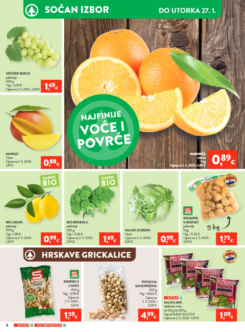 hrskave grickalice 8 naranča rinfuza 1 kg cijena na 2. 5. 2025.: 1,49 € 0 , 89 € pistacija suhopržena 300 g 1 kg = 16,63 € cijena na 2. 5. 2025.: 5,99 € grožđe bijelo pakiranje 500 g 1 kg = 3,38 € cijena na 2. 5. 2025.: 2,39 € bio limun pakiranje 500 g 1 kg = 1,98 € cijena na 2. 5. 2025.: 1,29 € 1 , 69 € 0 , 99 € mango 1 kom cijena na 2. 5. 2025.: 1,19 € 0 , 88 € bio brokula pakiranje 500 g 1 kg = 3,38 € cijena na 2. 5. 2025.: 1,99 € 1 , 69 € kikiriki u ljusci 400 g 1 kg = 3,98 € cijena na 2. 5. 2025.: 1,59 € 1 , 59 € salata iceberg 1 kom cijena na 2. 5. 2025.: 1,59 € 0 , 99 € krumpir s-budget pakiranje 5 kg 1 kg = 0,35 € cijena na 2. 5. 2025.: 3,99 € 1 , 75 € salata mix odabrane vrste od 125 g do 250 g 1 kg od 4,36 € do 8,72 € cijena na 2. 5. 2025.: 1,59 € 1 , 09 € 4 , 99 € najfinije voće i povrće 5 kg do utorka 27. 1. sočan izbor