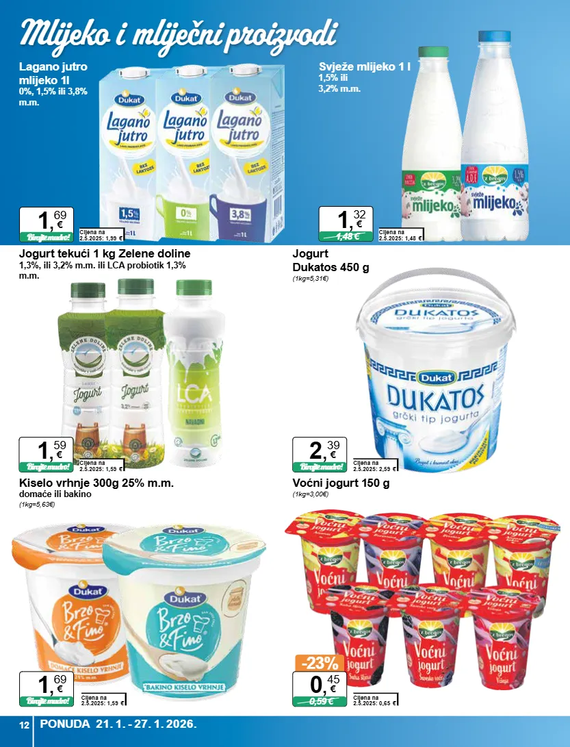 cijena na 2.5.2025: 2,59 € cijena na 2.5.2025: 1,99 € cijena na 2.5.2025: 1,59 € cijena na 2.5.2025: 1,48 € cijena na 2.5.2025: 0,65 € cijena na 2.5.2025: 1,59 € jogurt dukatos 450 g (1kg=5,31€) birajte mudro! 2 , 39 € lagano jutro mlijeko 1l 0%, 1,5% ili 3,8% m.m. birajte mudro! 1 , 69 € kiselo vrhnje 300g 25% m.m. domaće ili bakino (1kg=5,63€) birajte mudro! 1 , 69 € svježe mlijeko 1 l 1,5% ili 3,2% m.m. 1,48 € 1 , 32 € voćni jogurt 150 g (1kg=3,00€) -23% 0,59 € 0 , 45 € jogurt tekući 1 kg zelene doline 1,3%, ili 3,2% m.m. ili lca probiotik 1,3% m.m. birajte mudro! 1 , 59 € 12 mlijeko i mliječni proizvodi ponuda 21. 1. - 27. 1. 2026.