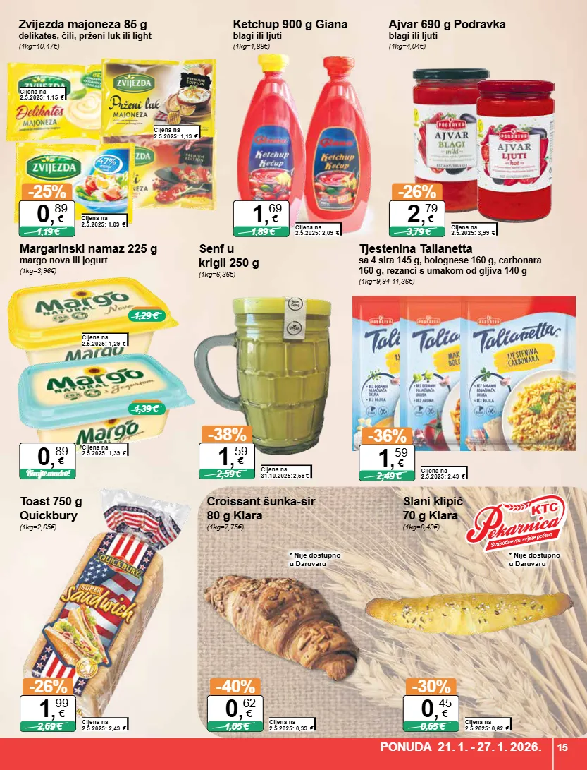 cijena na 2.5.2025: 1,15 € cijena na 2.5.2025: 1,09 € cijena na 2.5.2025: 1,19 € cijena na 2.5.2025: 1,39 € cijena na 2.5.2025: 1,29 € cijena na 2.5.2025: 0,99 € cijena na 2.5.2025: 0,62 € cijena na 2.5.2025: 2,09 € cijena na 2.5.2025: 3,99 € cijena na 2.5.2025: 2,49 € cijena na 31.10.2025:2,59 € cijena na 2.5.2025: 2,49 € p p ekarnica ekarnica kt ktc c p ekarnica ktc 1,29 € 1,39 € * nije dostupno u daruvaru * nije dostupno u daruvaru zvijezda majoneza 85 g delikates, čili, prženi luk ili light (1kg=10,47€) -25% 1,19 € 0 , 89 € margarinski namaz 225 g margo nova ili jogurt (1kg=3,96€) birajte mudro! 0 , 89 € croissant šunka-sir 80 g klara (1kg=7,75€) -40% 1,05 € 0 , 62 € slani klipić 70 g klara (1kg=6,43€) -30% 0,65 € 0 , 45 € ketchup 900 g giana blagi ili ljuti (1kg=1,88€) 1,89 € 1 , 69 € ajvar 690 g podravka blagi ili ljuti (1kg=4,04€) -26% 3,79 € 2 , 79 € toast 750 g quickbury (1kg=2,65€) -26% 2,69 € 1 , 99 € senf u krigli 250 g (1kg=6,36€) -38% 2,59 € 1 , 59 € tjestenina talianetta sa 4 sira 145 g, bolognese 160 g, carbonara 160 g, rezanci s umakom od gljiva 140 g (1kg=9,94-11,36€) -36% 2,49 € 1 , 59 € ponuda 21. 1. - 27. 1. 2026. 15