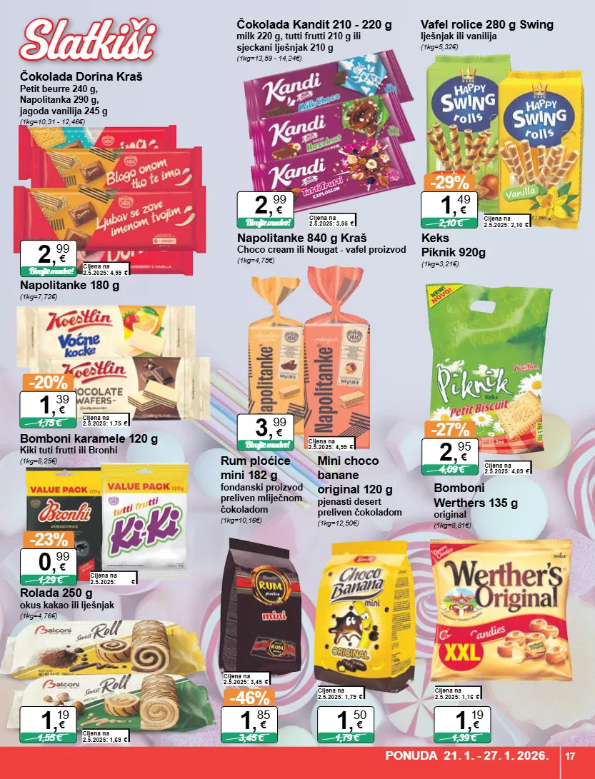 cijena na 2.5.2025: 1,16 € cijena na 2.5.2025: 3,45 € cijena na 2.5.2025: 3,95 € cijena na 2.5.2025: 1,75 € cijena na 2.5.2025: 4,09 € cijena na 2.5.2025: 1,69 € cijena na 2.5.2025: 2,10 € cijena na 2.5.2025: 4,99 € cijena na 2.5.2025: 4,99 € cijena na 2.5.2025: € bomboni werthers 135 g original (1kg=8,81€) 1,39 € 1 , 19 € rum ploćice mini 182 g fondanski proizvod preliven mliječnom čokoladom (1kg=10,16€) -46% 3,45 € 1 , 85 € mini choco banane original 120 g pjenasti desert preliven čokoladom (1kg=12,50€) cijena na 2.5.2025: 1,79 € 1,79 € 1 , 50 € čokolada kandit 210 - 220 g milk 220 g, tutti frutti 210 g ili sjeckani lješnjak 210 g (1kg=13,59 - 14,24€) birajte mudro! 2 , 99 € napolitanke 180 g (1kg=7,72€) -20% 1,75 € 1 , 39 € keks piknik 920g (1kg=3,21€) -27% 4,09 € 2 , 95 € rolada 250 g okus kakao ili lješnjak (1kg=4,76€) 1,55 € 1 , 19 € vafel rolice 280 g swing lješnjak ili vanilija (1kg=5,32€) -29% 2,10 € 1 , 49 € napolitanke 840 g kraš choco cream ili nougat - vafel proizvod (1kg=4,75€) birajte mudro! 3 , 99 € čokolada dorina kraš petit beurre 240 g, napolitanka 290 g, jagoda vanilija 245 g (1kg=10,31 - 12,46€) birajte mudro! 2 , 99 € bomboni karamele 120 g kiki tuti frutti ili bronhi (1kg=8,25€) -23% 1,29 € 0 , 99 € ponuda 21. 1. - 27. 1. 2026. 17 slatkiši slatkiši
