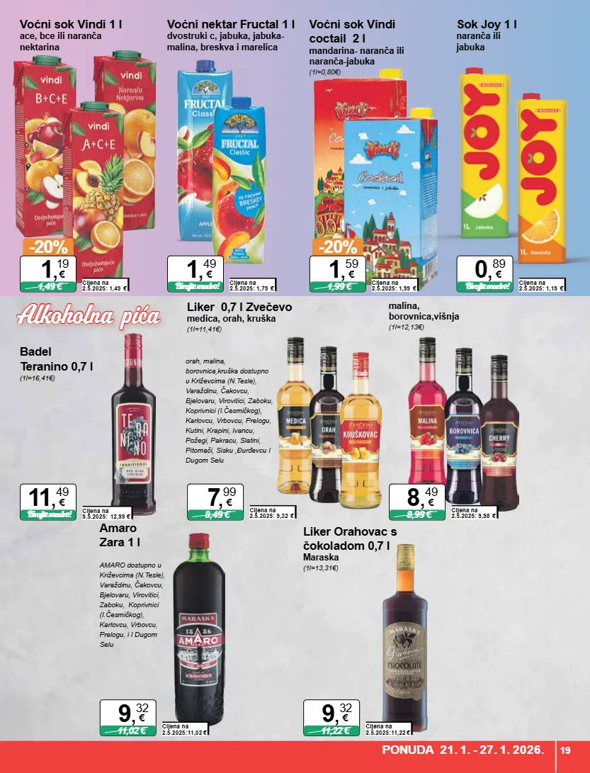 amaro dostupno u križevcima (n.tesle), varaždinu, čakovcu, bjelovaru, virovitici, zaboku, koprivnici (i.česmičkog), karlovcu, vrbovcu, prelogu, i i dugom selu cijena na 2.5.2025: 1,79 € cijena na 2.5.2025: 1,49 € cijena na 2.5.2025: 1,99 € cijena na 2.5.2025: 1,19 € cijena na 9.5.2025: 12,99 € cijena na 2.5.2025: 9,32 € cijena na 2.5.2025: 9,98 € cijena na 2.5.2025:11,02 € cijena na 2.5.2025:11,22 € voćni nektar fructal 1 l dvostruki c, jabuka, jabuka- malina, breskva i marelica birajte mudro! 1 , 49 € voćni sok vindi 1 l ace, bce ili naranča nektarina -20% 1,49 € 1 , 19 € voćni sok vindi coctail 2 l mandarina- naranča ili naranča-jabuka (1l=0,80€) -20% 1,99 € 1 , 59 € sok joy 1 l naranča ili jabuka birajte mudro! 0 , 89 € badel teranino 0,7 l (1l=16,41€) birajte mudro! 11 , 49 € liker 0,7 l zvečevo medica, orah, kruška (1l=11,41€) 8,49 € 7 , 99 € malina, borovnica,višnja (1l=12,13€) 8,99 € 8 , 49 € amaro zara 1 l 11,02 € 9 , 32 € liker orahovac s čokoladom 0,7 l maraska (1l=13,31€) 11,22 € 9 , 32 € orah, malina, borovnica,kruška dostupno u križevcima (n.tesle), varaždinu, čakovcu, bjelovaru, virovitici, zaboku, koprivnici (i.česmičkog), karlovcu, vrbovcu, prelogu, kutini, krapini, ivancu, požegi, pakracu, slatini, pitomači, sisku ,đurđevcu i dugom selu ponuda 21. 1. - 27. 1. 2026. 19 alkoholna pića alkoholna pića